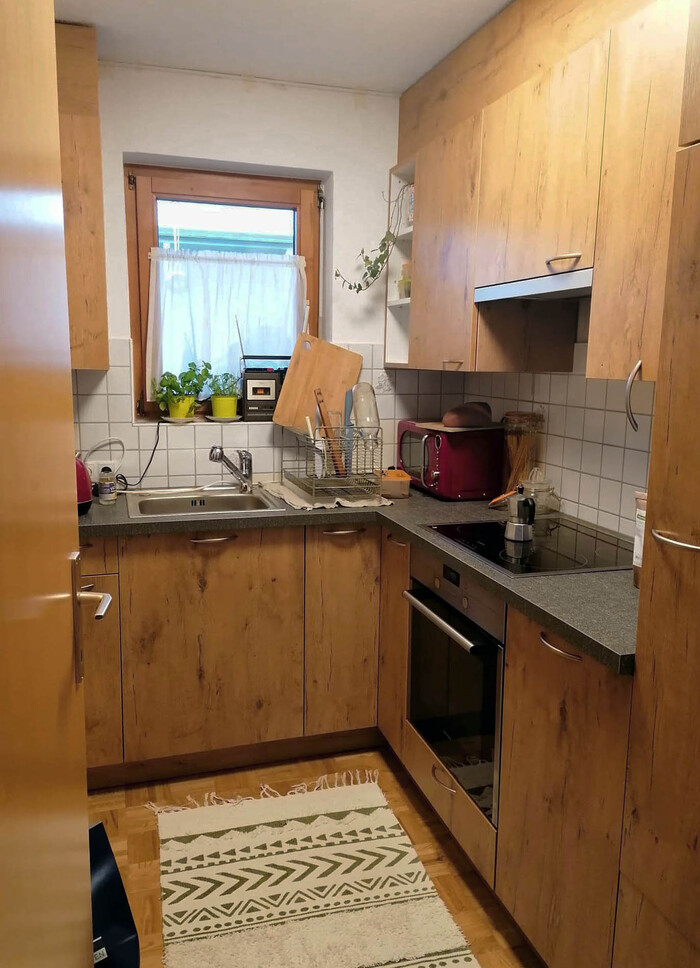 Mit der Küche in Holzoptik wird der Platz der kleinen Küchennische optimal ausgenutzt. Zudem verfügt die Küche über ein kleines Fenster in den Innenhof.