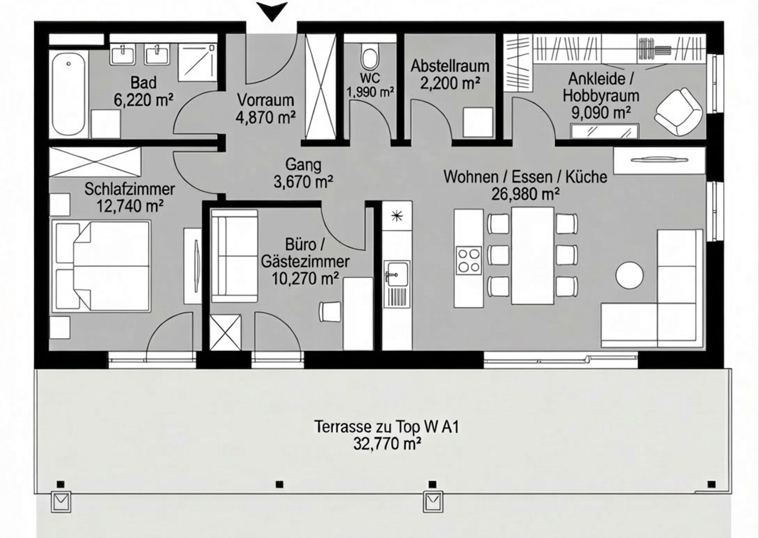 Der Eingangsbereich (Vorraum Gang) erschließt alle Räume zentral. Herzstück der Wohnung ist der ca. 27 m2 große, offene Wohn-, Ess- und Küchenbereich. Die breite Fensterfront sorgt für viel Tageslicht und bietet Zugang zur Hauptattraktion: einer ca. 33 m2 großen Terrasse. Diese erstreckt sich über die gesamte Breite der Einheit und bietet vielfältige Nutzungsmöglichkeiten im Freien.