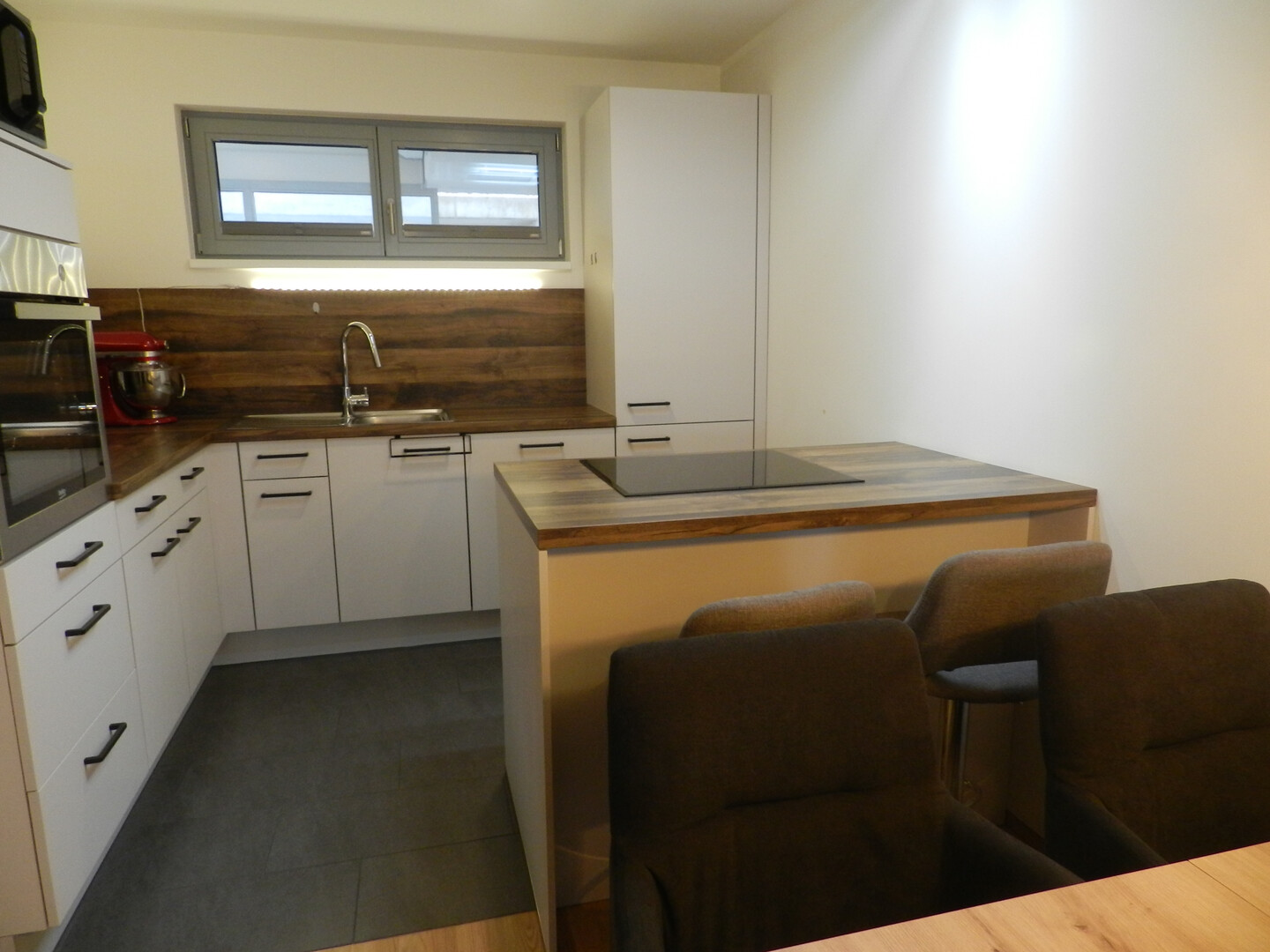 Die neuwertige, moderne Einbauküche mit Kochinsel verfügt über viel Stauraum und ist mit Top-Geräten ausgestattet.