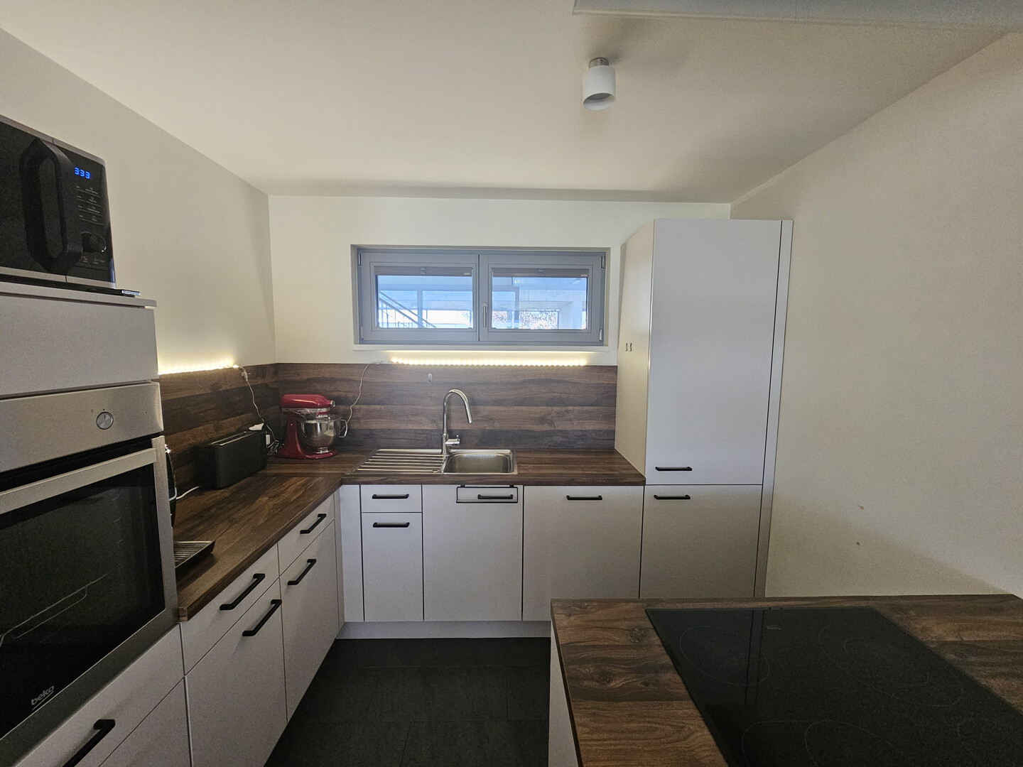 Die neuwertige, moderne Einbauküche mit Kochinsel verfügt über viel Stauraum und ist mit Top-Geräten ausgestattet.
