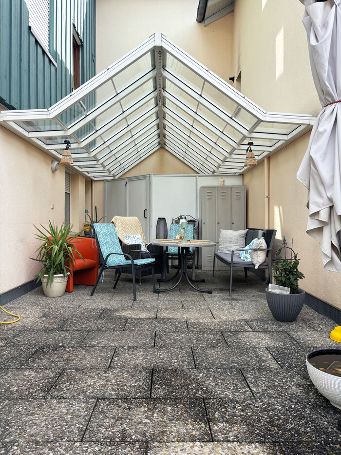 Vom Wintergarten aus gelangt man direkt auf den überdachten Sitzplatz und in den Garten, der Raum für Erholung im Freien bietet. Ein kleiner Geräteschopf sorgt für zusätzlichen Stauraum.