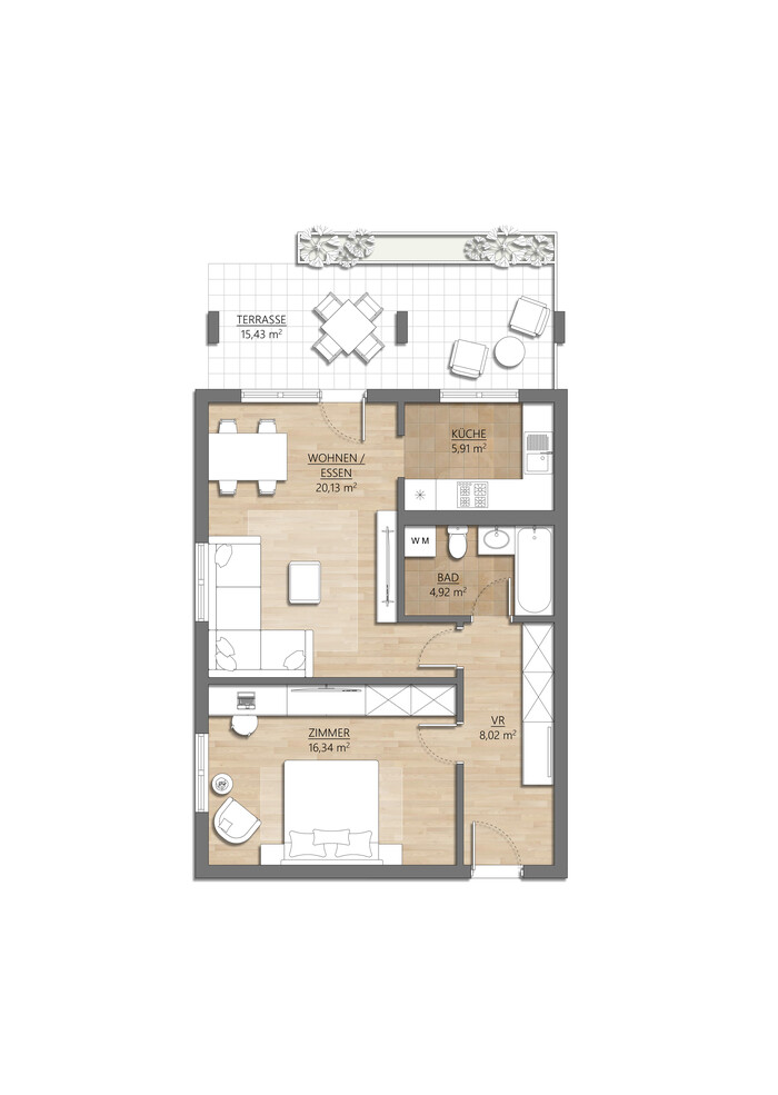Die Wohnung liegt ostseitig im Erdgeschoss eines gepflegten Mehrparteienhauses. Das Herzstück ist der großzügige Wohn-/Essbereich mit direktem Zugang zur Terrasse und in den Garten. Die Küche ist praktisch integriert und bietet kurze Wege im Alltag. Ein separates Schlafzimmer sorgt für Ruhe und Privatsphäre. Das Badezimmer ist schön ausgestattet und verfügt über einen Waschmaschinenanschluss.
