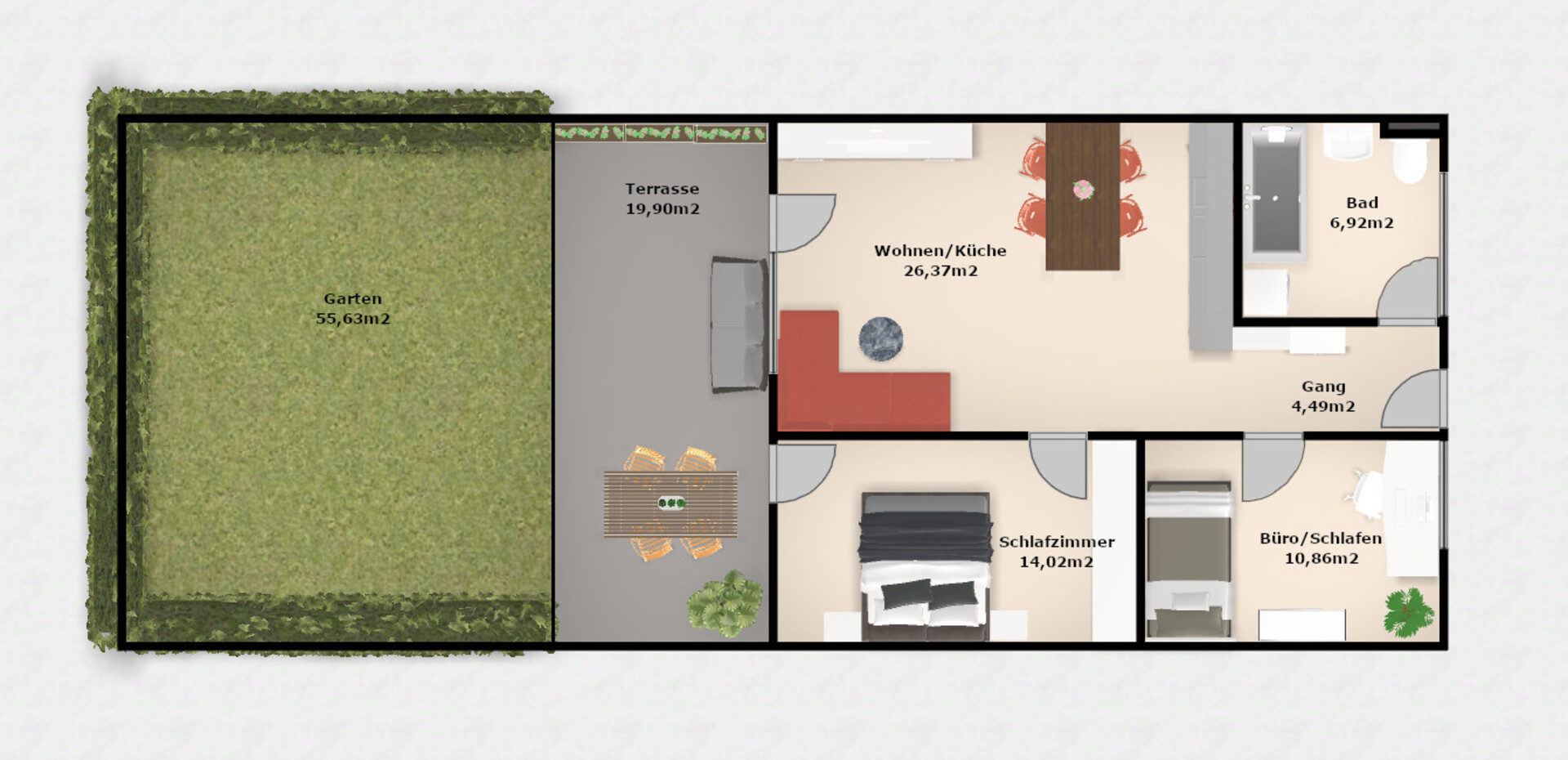 Die Wohnung verfügt über eine großzügige Terrasse mit 19,90 m², die zum Entspannen im Freien einlädt. Der dazugehörige Garten mit 55,63 m² bietet zusätzlichen Platz im Grünen. Ein Keller mit 5,41 m² sorgt für extra Stauraum und Ordnung.