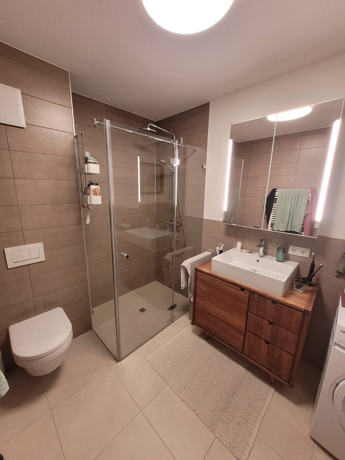 Das Badezimmer verfügt über eine bodenebene Dusche mit Regenduschkopf, WC, Waschtisch und Waschmaschinenanschluss.