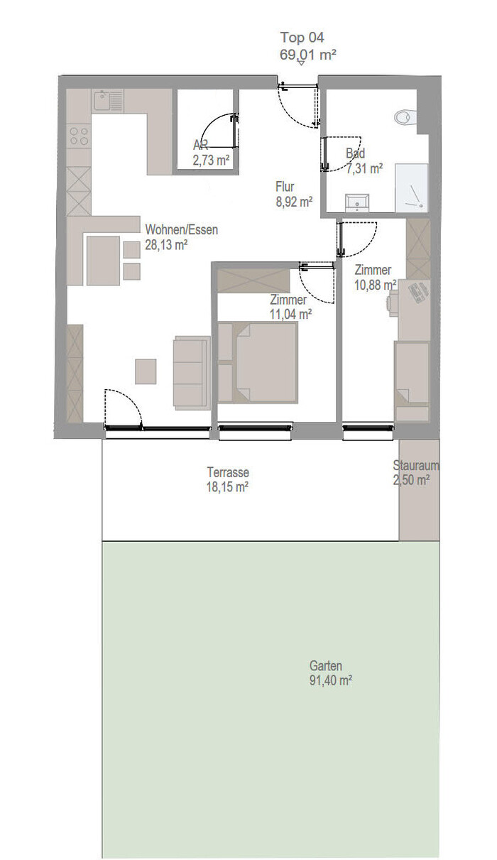 69 m² Wohnfläche mit durchdachtem Grundriss, Wohn-Essbereich, 2 Schlafzimmer, Badezimmer, Abstellraum. 18 m² Terrasse mit Stauraum und ca. 90 m² Garten.