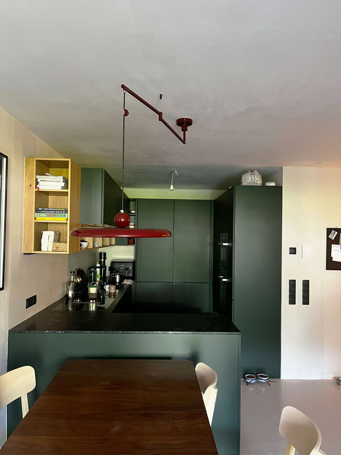 - Küche in waldgrün matt mit schwarzer Granitplatte und Qualitätsbeschläge von Blum. Hochwertige Einbaugeräte von Miele: Induktionskochfeld, Geschirrspüler, Kühlschrank, Dampfgarer, Backofen