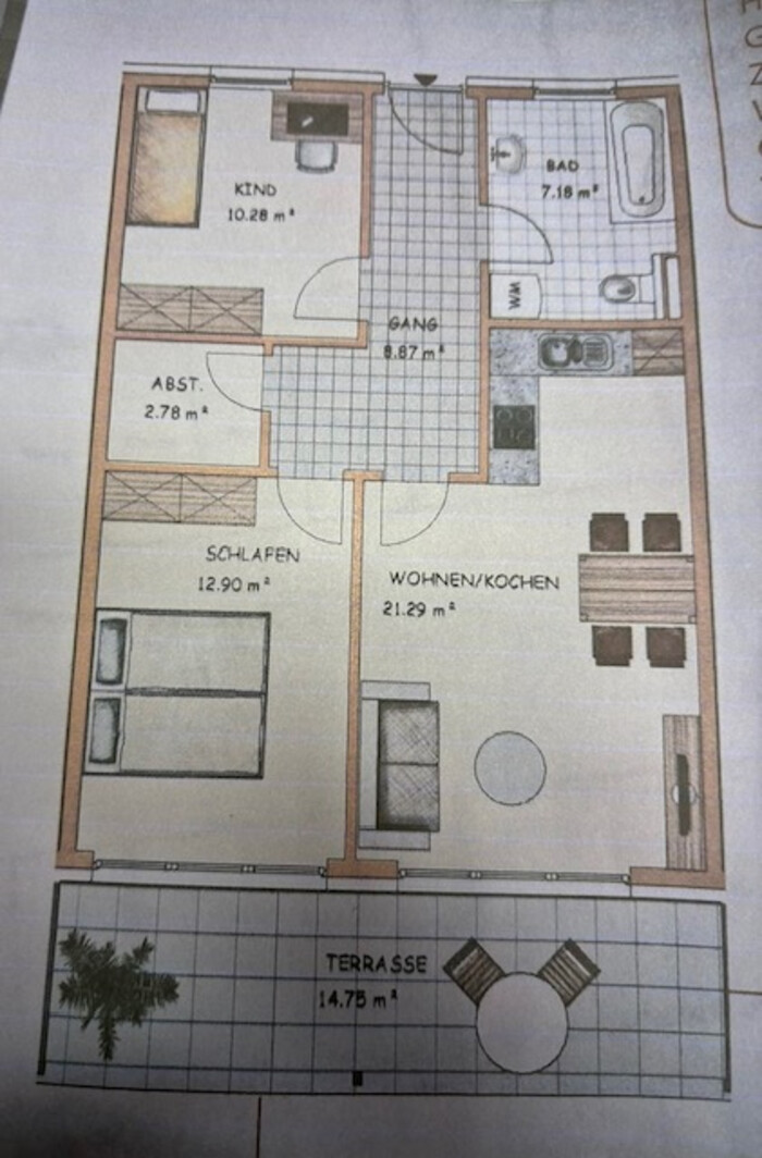 Zur Wohnung gehören ein Garten mit 44,17 m², eine Terrasse mit 14,75 m², Wohnen/Kochen mit 21,27 m², ein Schlafzimmer mit 12,90 m², ein Kinderzimmer mit 10,28 m², Bad mit 7,18 m², Gang mit 8,87m² und ein Abstellraum mit 2.78 m².