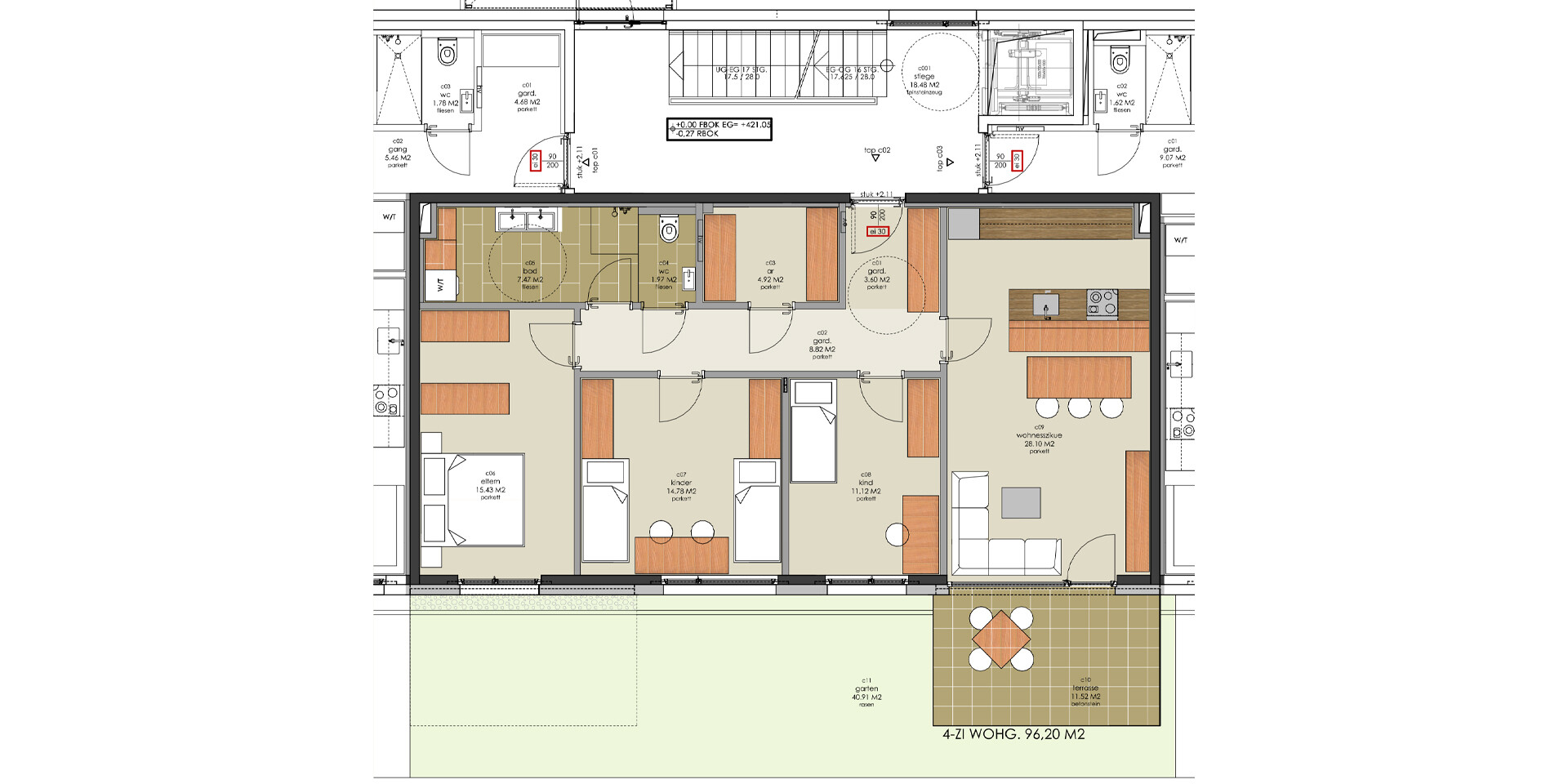 Mit ca. 96,20 m² Wohnfläche, einer großzügigen Terrasse und einem eigenen Garten bietet Wohnung C02 ein durchdachtes Wohnkonzept für anspruchsvolle Käufer:innen.