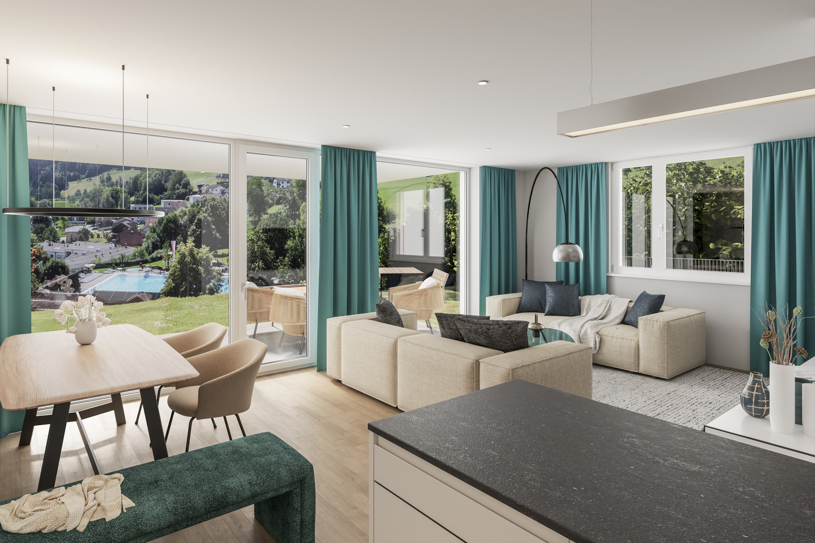 In der idyllischen Gemeinde Frastanz entsteht das exklusive Wohnprojekt "WA Maria Grüner Straße", das sich harmonisch mit Blick zum ältesten Schwimmbad Vorarlbergs einfügt.