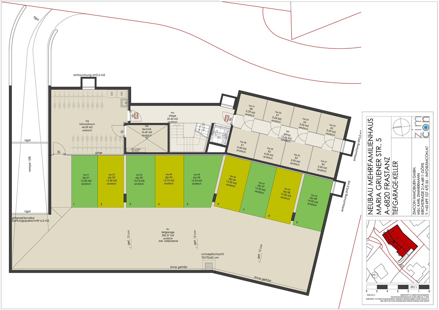 Im Untergeschoss befinden sich neben der Tiefgarage ein Fahrradabstellraum, ein Technikraum sowie 8 Kellerabteile.