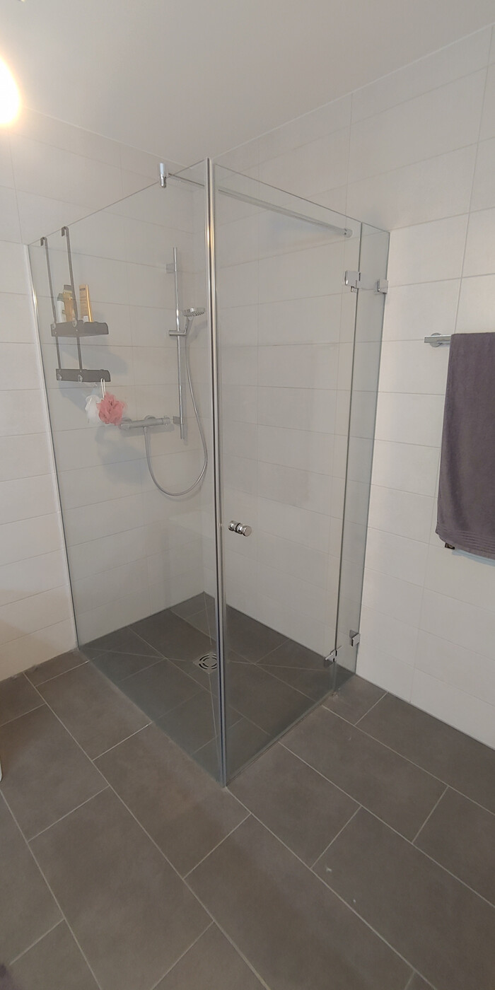 - Extra breites Waschbecken mit Stauraum im Badezimmer, große Ganz-Glas-Dusche