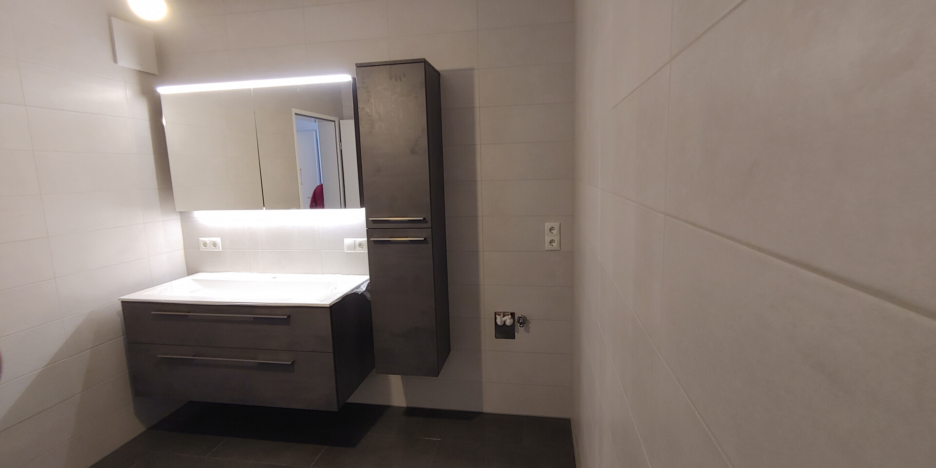 Das Badezimmer ist raumhoch mit Steinzeug gefliest. 120 ist hier das Maß aller Dinge: Die Ganzglas-Dusche mit Fliesenboden ohne Einstieg ist gleich 120 cm tief, ebenso wie es das Waschbecken samt Einbaumöbeln breit ist: 120 cm. Da haben Sie morgens auch nebeneinander Platz. Auch die Anschlussmöglichkeiten und genügend Platz für Waschmaschine und Trockner sind vorhanden.