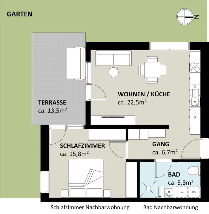 Zur Vermietung steht eine moderne 2-Zimmer-Wohnung in der Gehrenstraße 29 in 6837 Weiler, ab Februar 2026 bzw. auch früher nach Vereinbarung. Die ca. 50,8 m² große Wohnung im Erdgeschoss eines Neubaus (2018) verfügt über eine überdachte Terrasse, einen allgemein nutzbaren Garten, Kellerabteil und einen Tiefgaragenstellplatz; ein zweiter Stellplatz ist optional verfügbar.