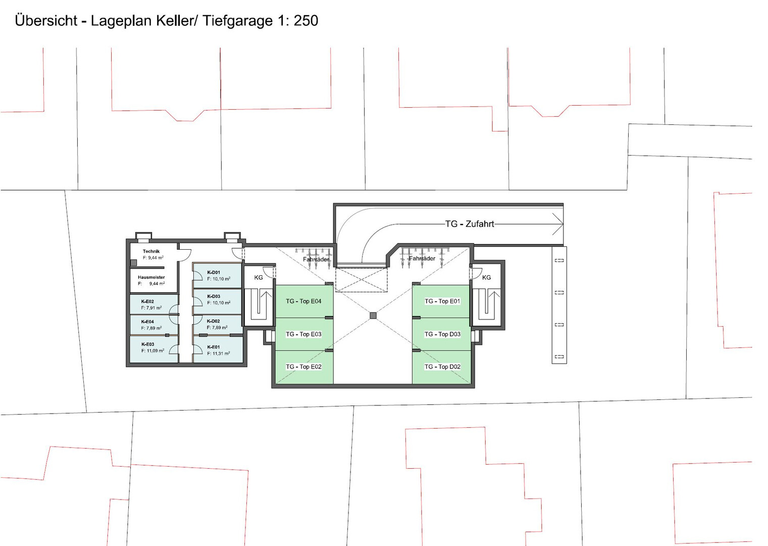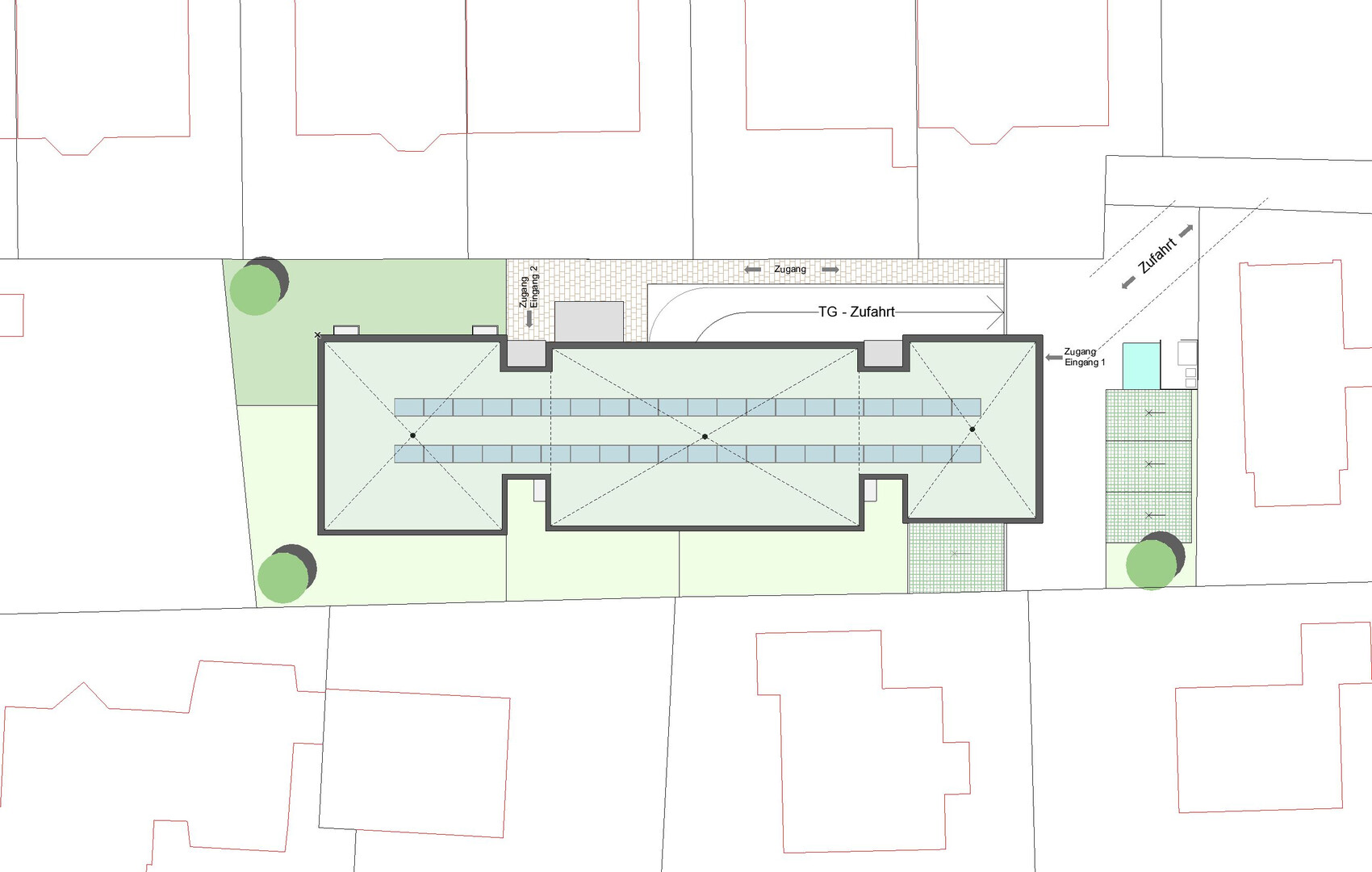 Die Kleinwohnanlage besteht aus 7 Wohnungen und verfügt über ein Kellergeschoss in dem die Kellerräume und die Tiefgarage untergebracht sind, sowie einem Erdgeschoss und einem Obergeschoss.