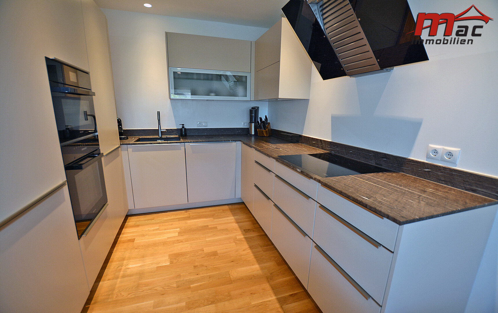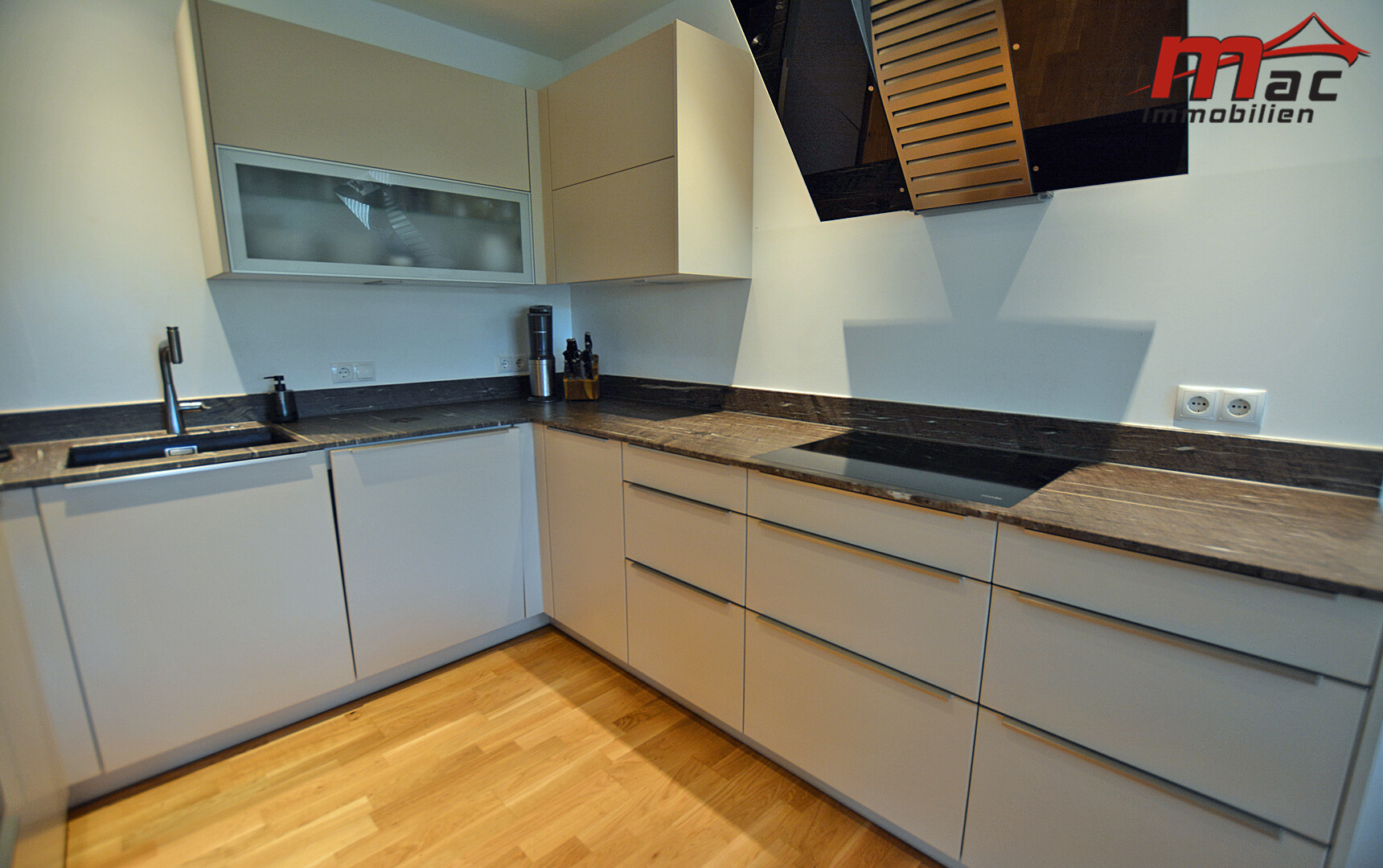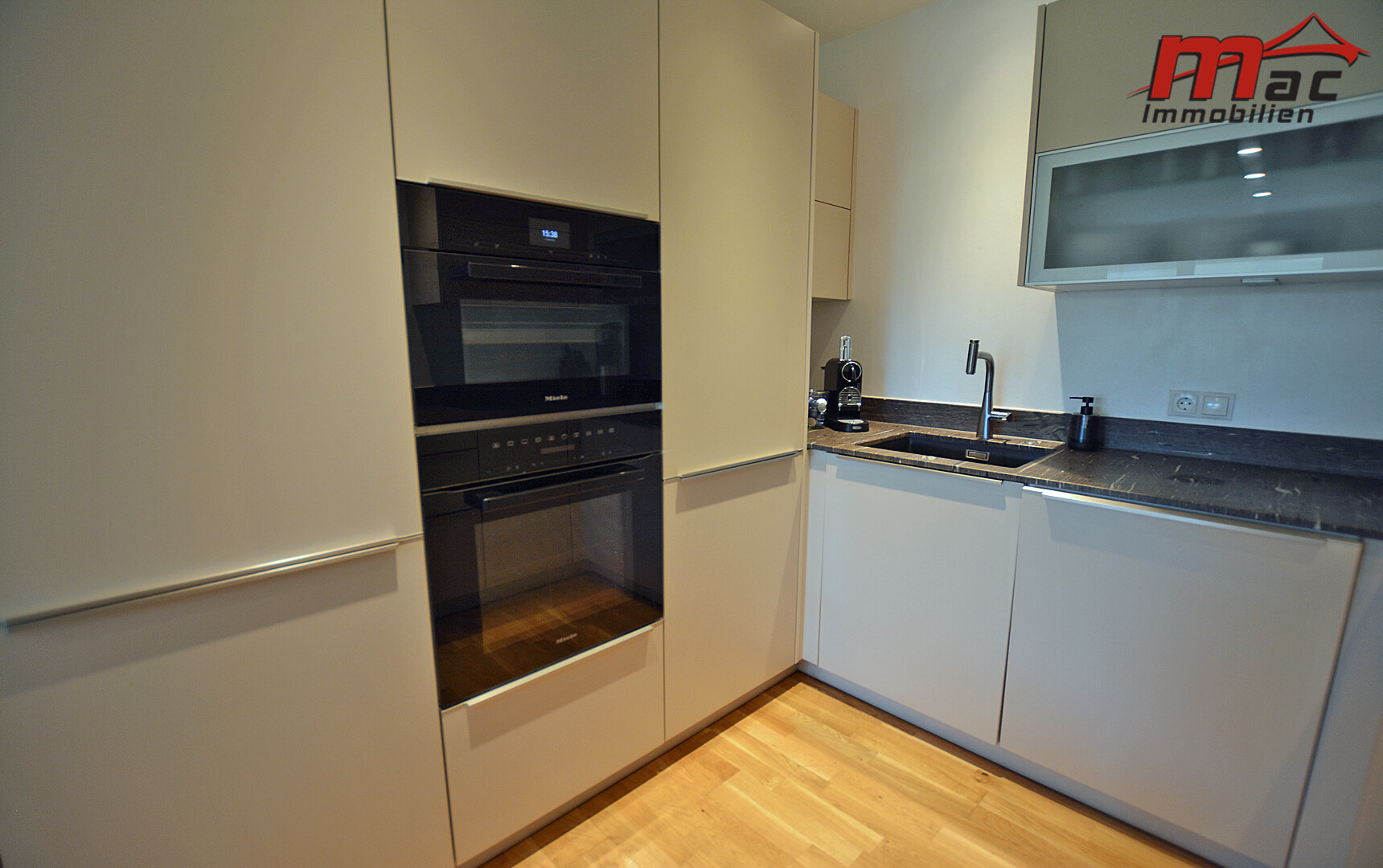 Die hochwertige DAN-Küche ist mit Miele-Geräten, einem extra großen Liebherr-Kühlschrank mit Bio-Fresh-Technologie, einem Dampf-Backkombigerät sowie einer Granit-Arbeitsplatte ausgestattet und bietet viel Stauraum.