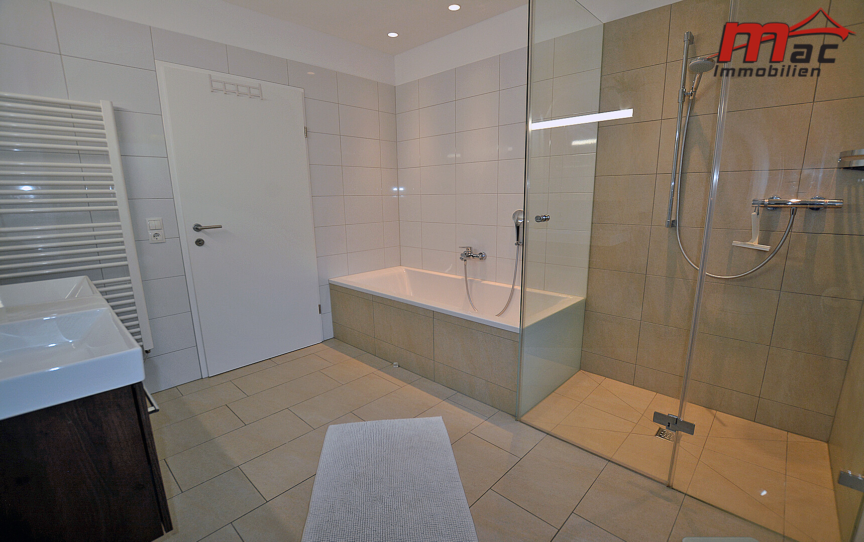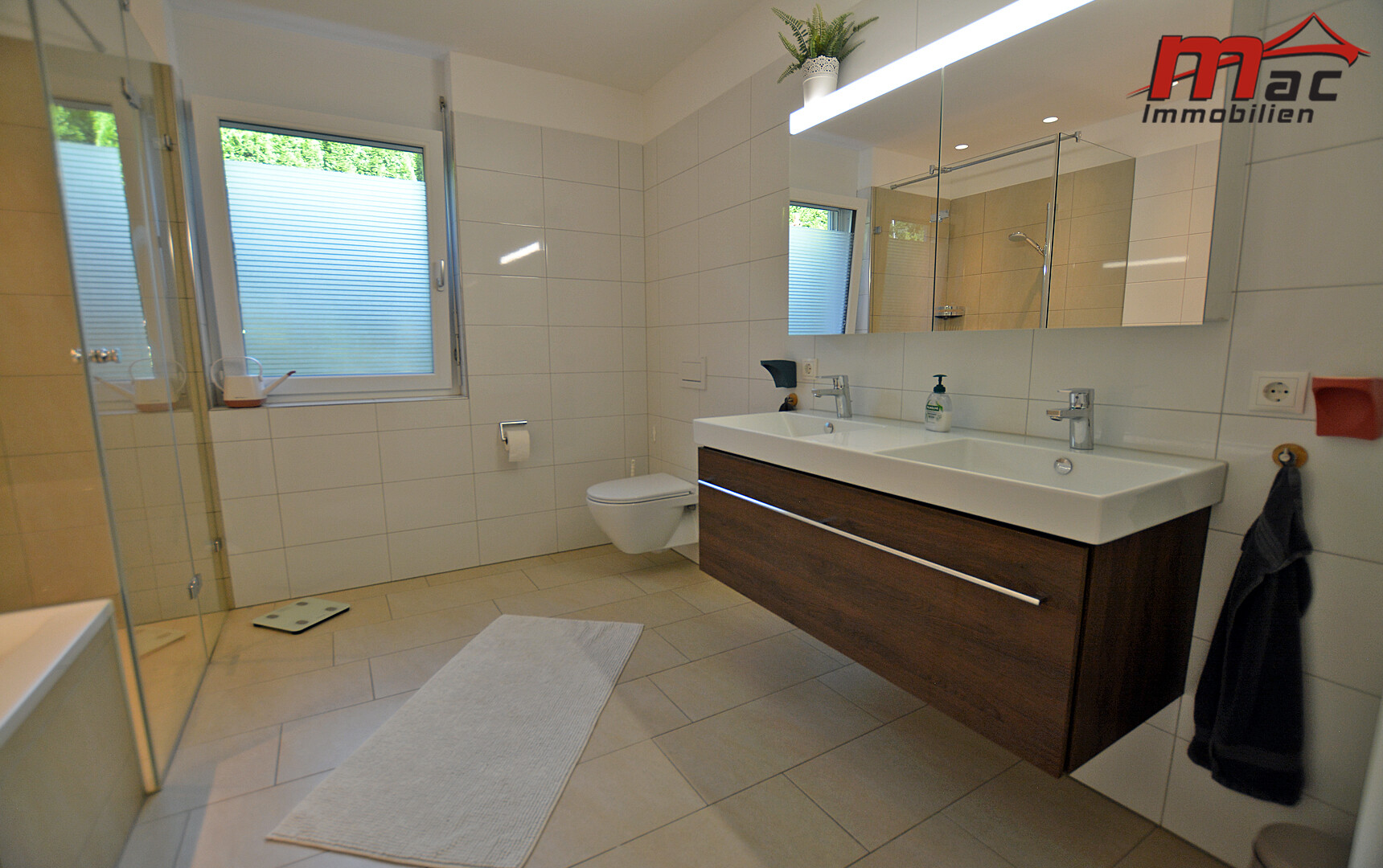 Das Tageslicht-Badezimmer überzeugt mit Badewanne, großer Dusche, Doppelwaschtisch mit Verbau und Handtuchwärmer.