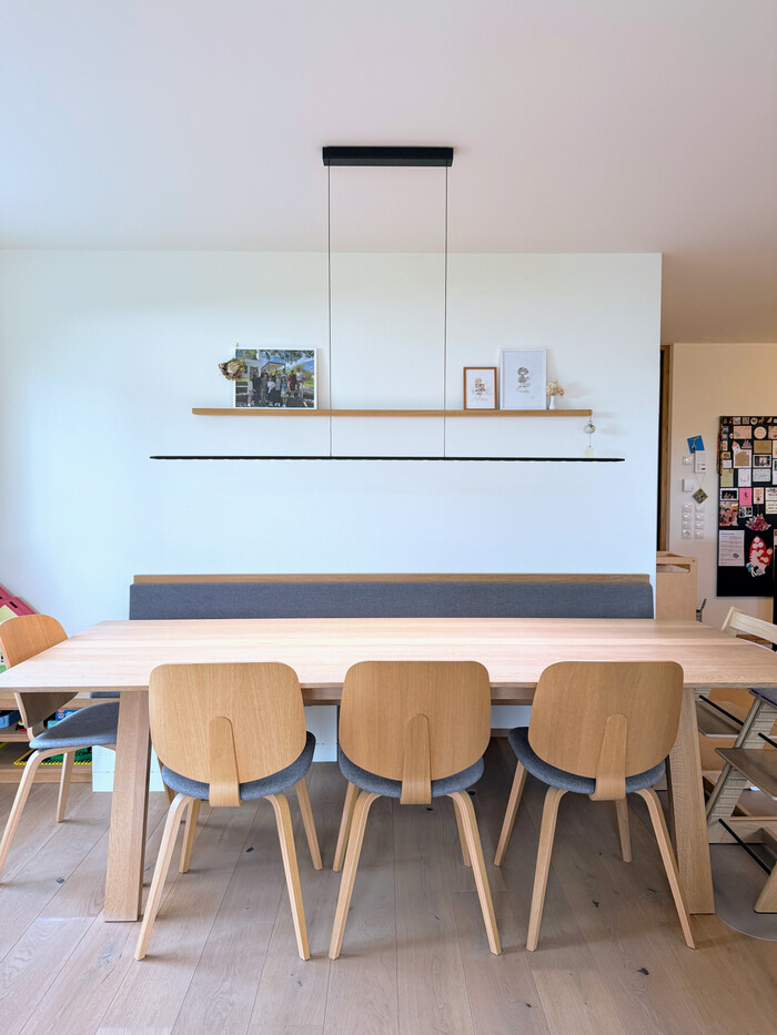 - 2 Badezimmer - Eltern-Badezimmer mit Unterputzarmaturen und Corian Doppelwaschtisch mit Tischler-Unterschrank in Eiche