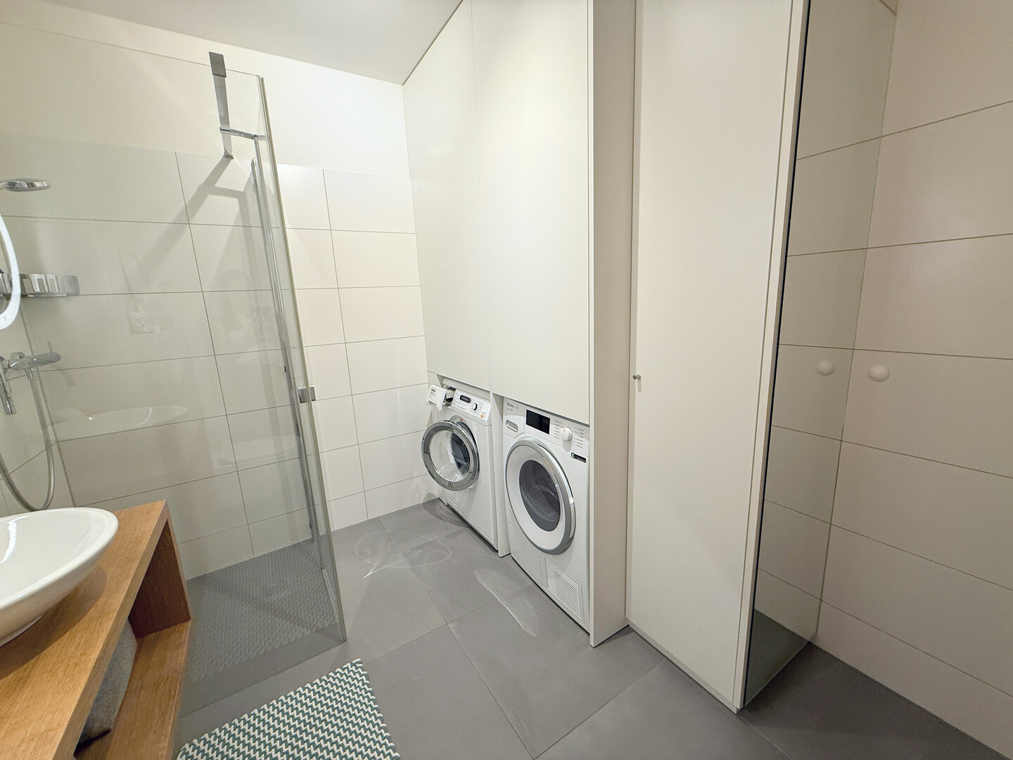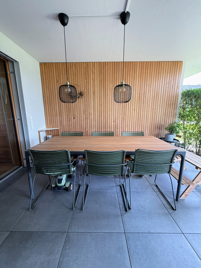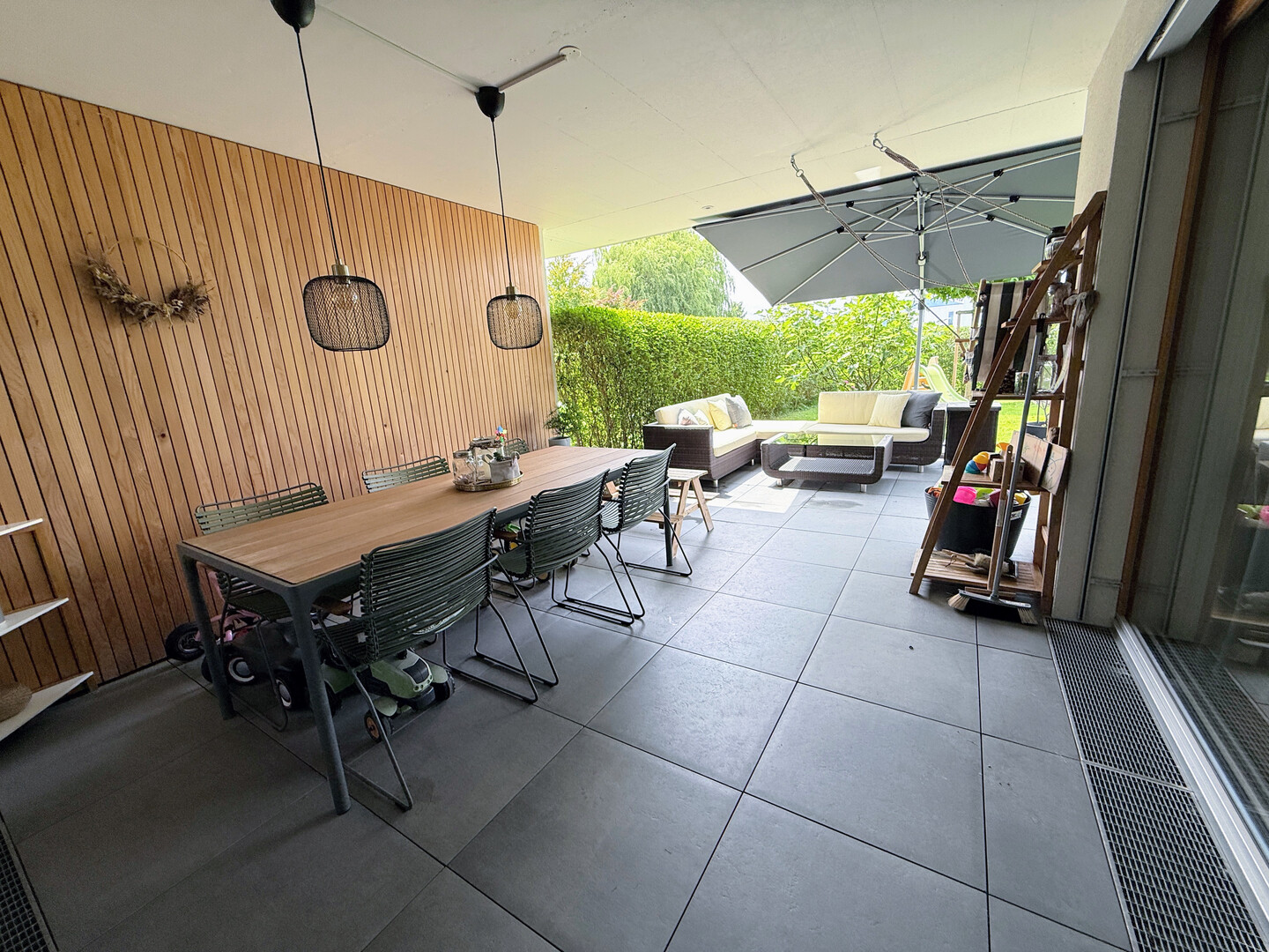 - 40 m2 (großteils überdacht) Terrasse mit Feinsteinzeug-Fliesen