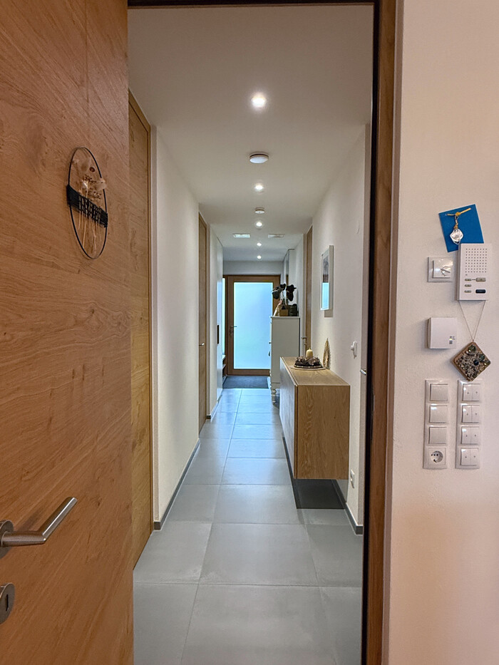 - Landhausdielen in Eiche in allen Zimmern, Steinzeug-Fliesen in Bädern & Gang
