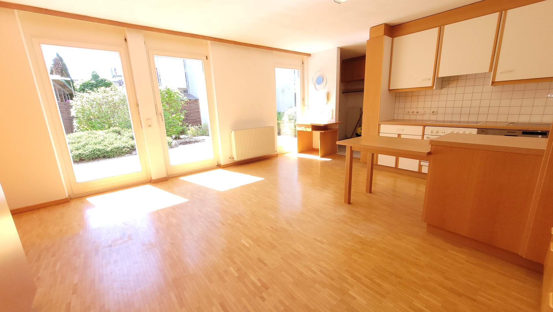 Der helle Wohn- und Schlafbereich bildet das Herzstück der Wohnung und verfügt über einen direkten Zugang zur Terrasse und dem eigenen Garten – ideal, um entspannte Stunden im Freien zu genießen.