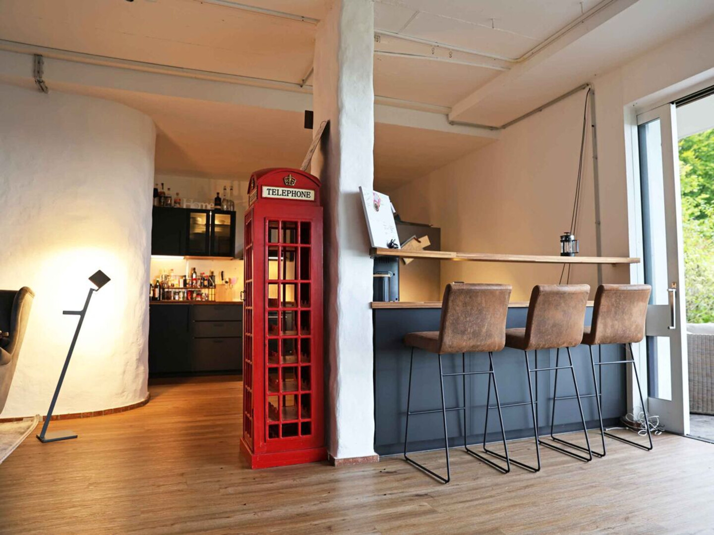 Die Ausstattung umfasst hochwertige Vinylböden, eine moderne Küchenzeile in Schwarz sowie verputzte, weiße Wände. Von den Vormietern (Film- und Fotostudio) können diverse Einbauten übernommen werden, darunter professionelle Schallschutzmaßnahmen, Beleuchtungssysteme sowie ein umfangreiches Netz an Bodensteckdosen. Ein weiterer Pluspunkt ist der großzügige Außenbereich mit Terrasse, zwei offenen Kaminen und einem beheizbaren Allzweckraum. Zwei überdachte und zwei zusätzliche Stellplätze stehen zur Verfügung.