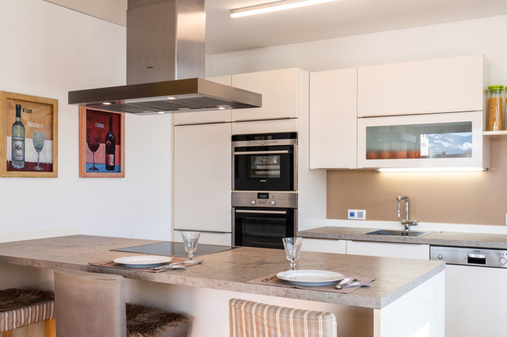 von großen, bodentiefen Fenstern geprägt, die für ausgezeichnete Lichtverhältnisse sorgen und dennoch volle Privatsphäre gewährleisten – die Wohnung ist von außen durchgängig uneinsehbar. Elektrisch betriebene Rollläden erhöhen den Komfort zusätzlich. Die hochwertige Einbauküche mit Siemens-Geräten bildet das Herzstück der Wohnung. Sie bietet neun fixe Sitzplätze und fasziniert mit einem weiten Blick über die Stadt und hinaus auf