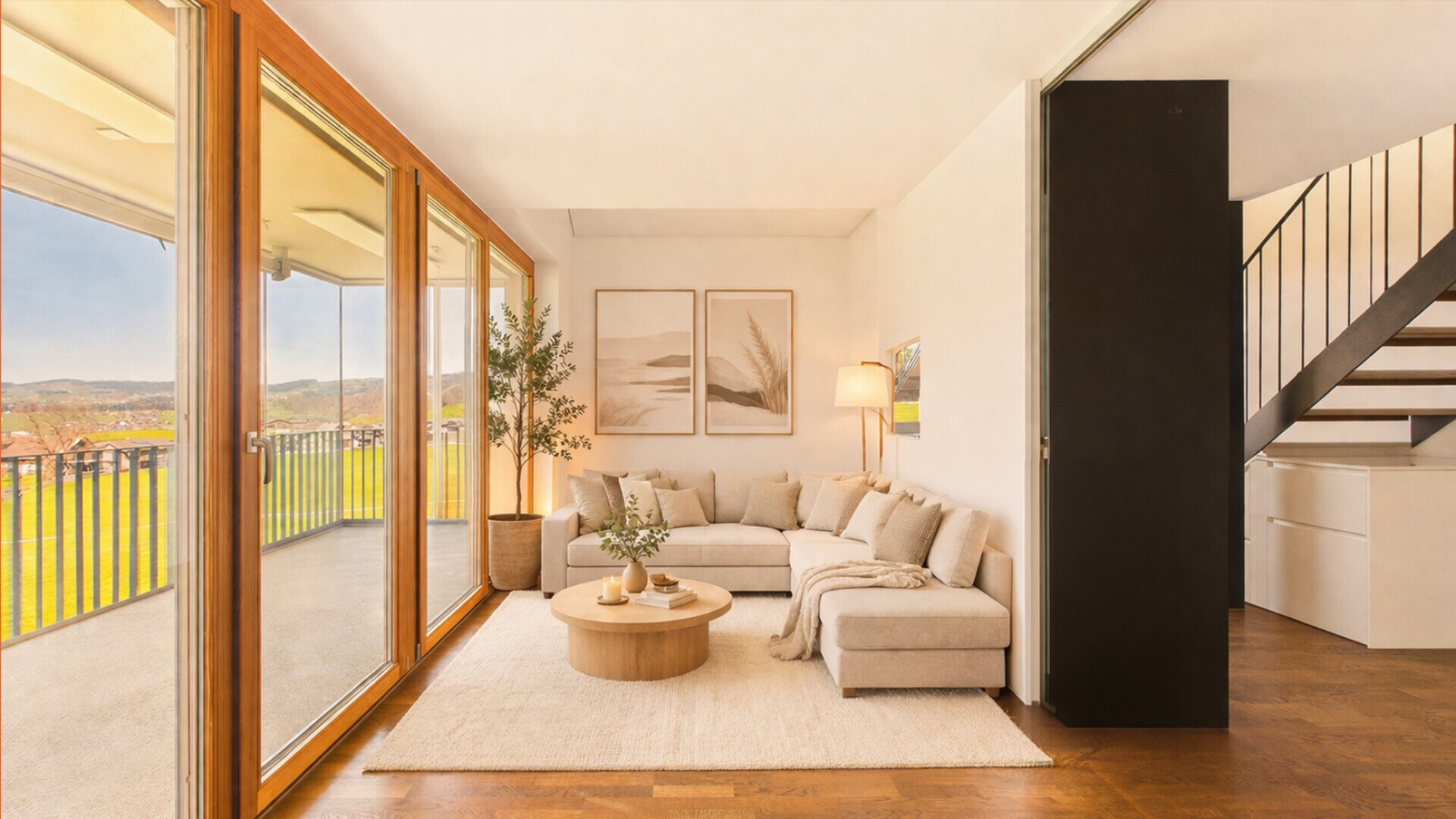 Der weitläufige Wohn-und Essbereich im Obergeschoss bildet den Mittelpunkt der Wohnung. Obwohl er als ein zusammenhängender Raum gestaltet ist, sorgt die durchdachte Platzierung von Küche und Essbereich für eine klare, dennoch offene Trennung zum Wohnbereich. Die Bereiche können mit der bereits eingebauten Glastüre geschlossen werden. Vom Wohnbereich aus gelangt man direkt auf die Loggia, die eine angenehme Erweiterung darstellt. In diesem Geschoss befindet sich zudem eine eigene große Terrasse, die zusätzlichen Außenraum bietet. Auf derselben Etage liegt ein weiteres Zimmer, das sich ideal als Büro, Gästezimmer oder Abstellraum eignet.