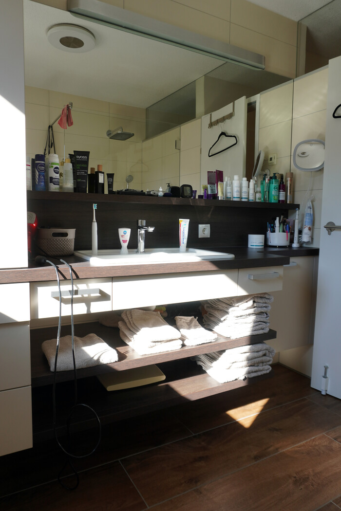 Ein besonderes Highlight der Wohnung ist die gemütliche Dachterrasse mit weitem Blick auf die Schweizer Berge – ausgestattet mit Markisen, die an sonnigen Tagen angenehmen Schatten spenden.