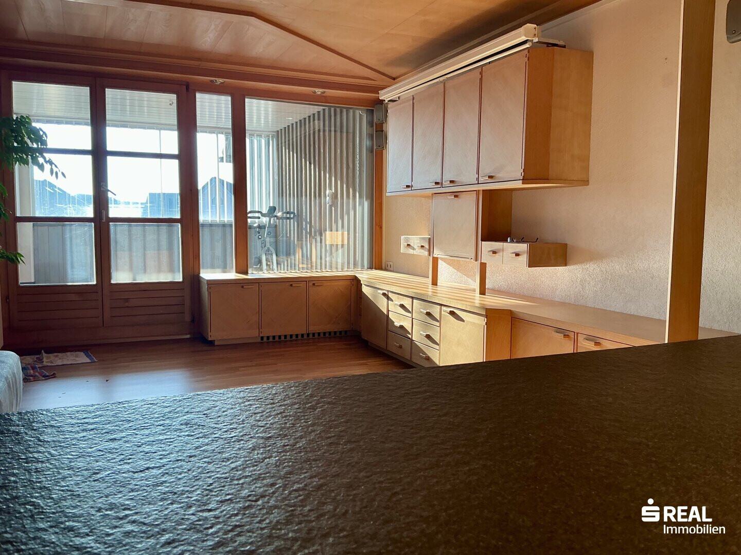 Im 1. Obergeschoss befinden sich der großzügige Wohn- und Essbereich mit moderner Einbauküche, ein praktischer Abstellraum unter der Treppe, ein Gäste-WC sowie das Badezimmer. Im Dachgeschoss erwarten Sie zwei helle Schlafzimmer und ein Flur. Von hier genießen Sie eine wunderschöne Aussicht Richtung Süden, unter anderem auf den Karren.