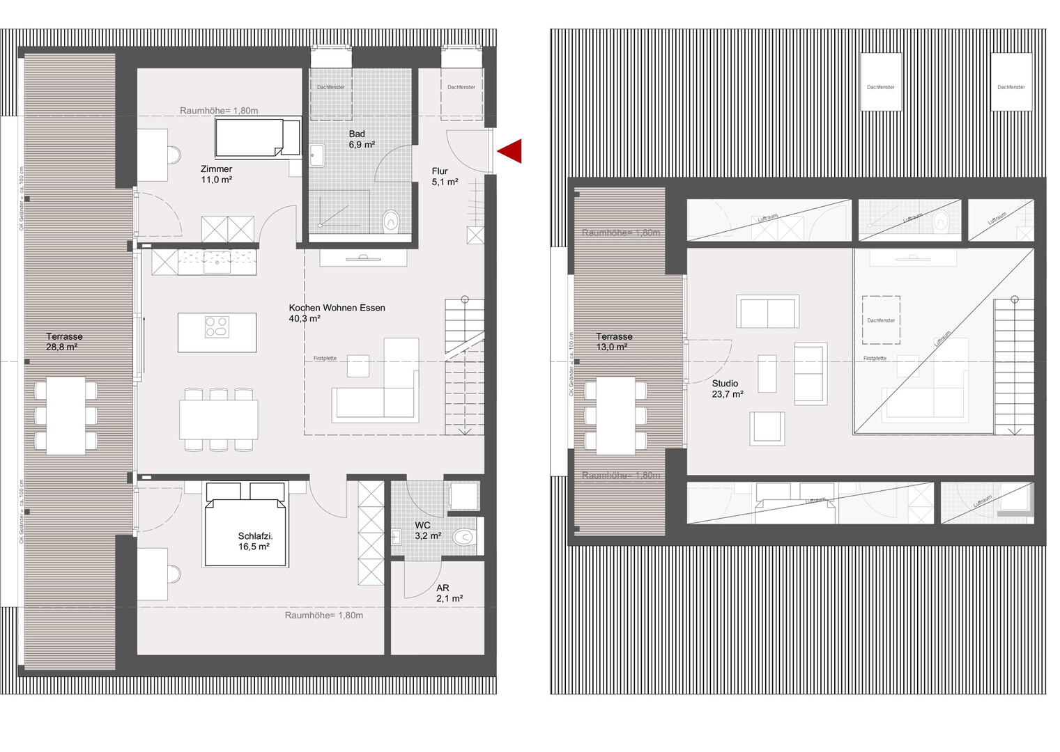 Auf der unteren Wohnebene erwarten Sie eine helle Wohnküche mit Zugang zur ersten und größeren Terrasse, zwei geräumige Schlafzimmer, ein modernes Badezimmer mit Doppelwaschtisch, Dusche und WC, sowie ein separates Gäste-WC mit integriertem Abstellraum. Die offene Gestaltung sorgt für ein angenehmes Wohngefühl und bietet vielseitige Einrichtungsmöglichkeiten.
