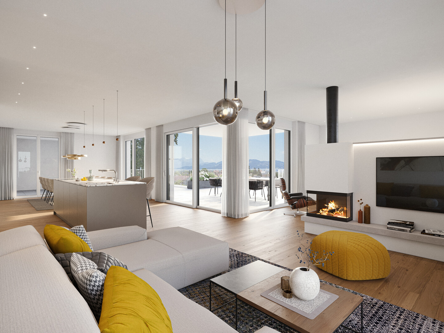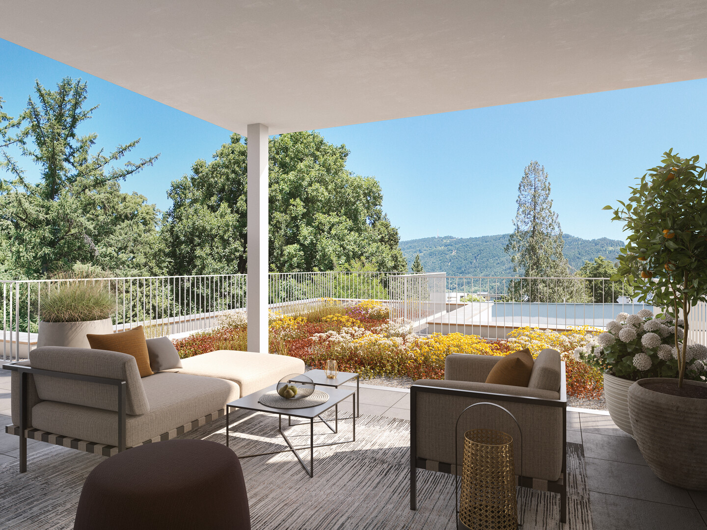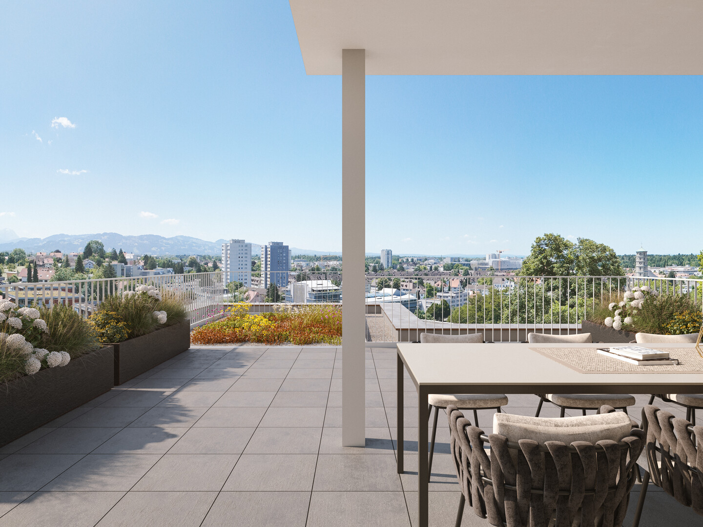 Wohnen über den Dächern - die je zur Hälfte überdachten Terrassen dieser Wohnung schaffen ein geschütztes Outdoor-Wohnzimmer, das zu jeder Jahreszeit genutzt werden kann. Genießen Sie die Weite, viel Tageslicht und eine private Rückzugsoase mit schönem Ausblick.