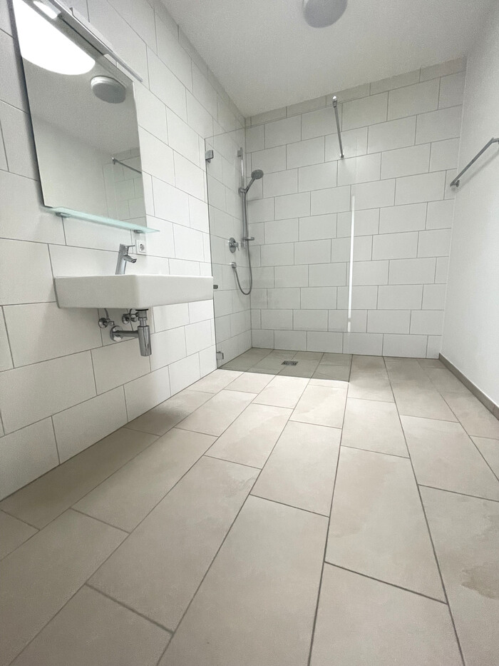 Das Badezimmer ist mit einer großen Dusche ausgestattet und verfügt über Tageslicht (Dachkuppel, öffenbar). Auch der Waschmaschinenanschluss befindet sich im Badezimmer. Das WC ist einem separaten Raum untergebracht.