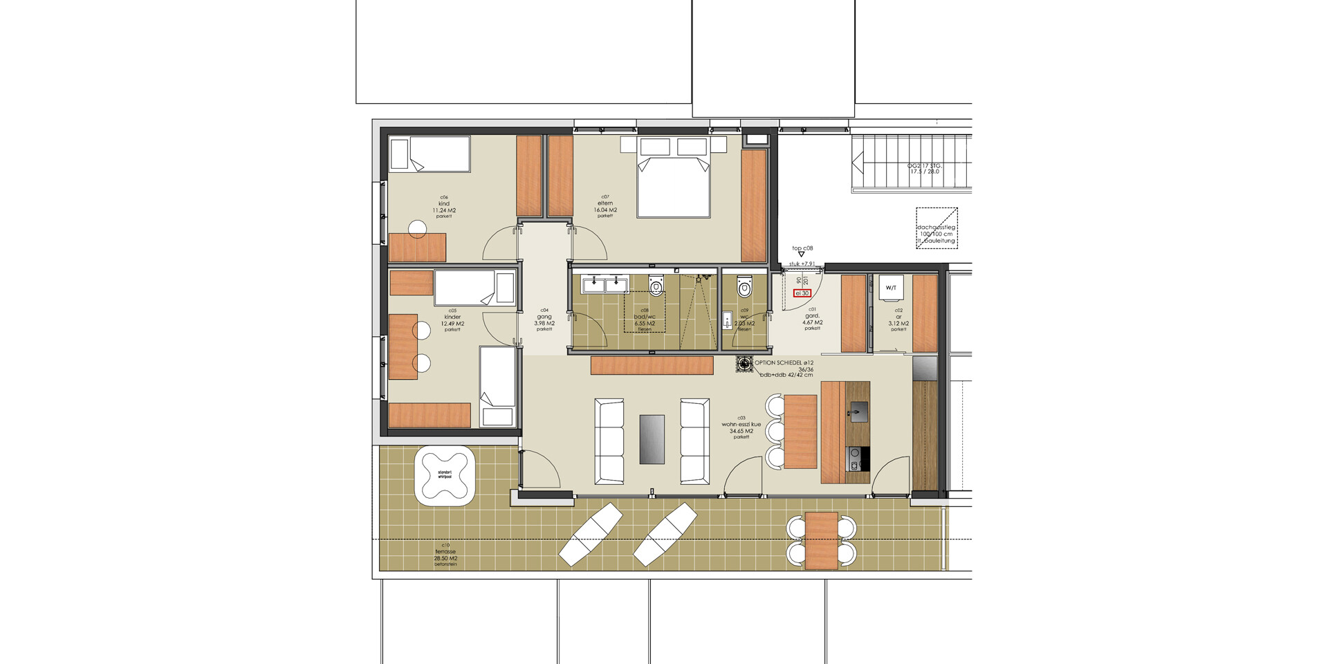 - Hochwertiger Klebeparkett in den Wohnräumen (Eiche oder Buche)