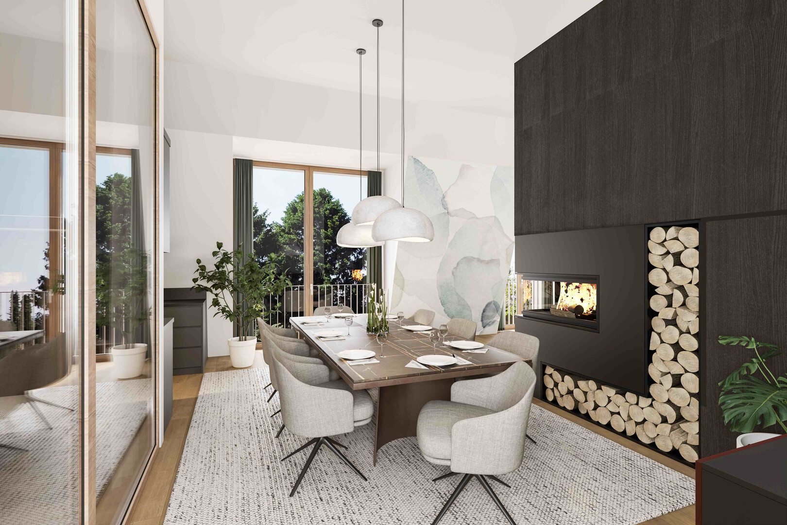 - raumhohe Fenster, die eine lichtdurchflutete, naturnahe und weitläufige Wohnatmosphäre schaffen