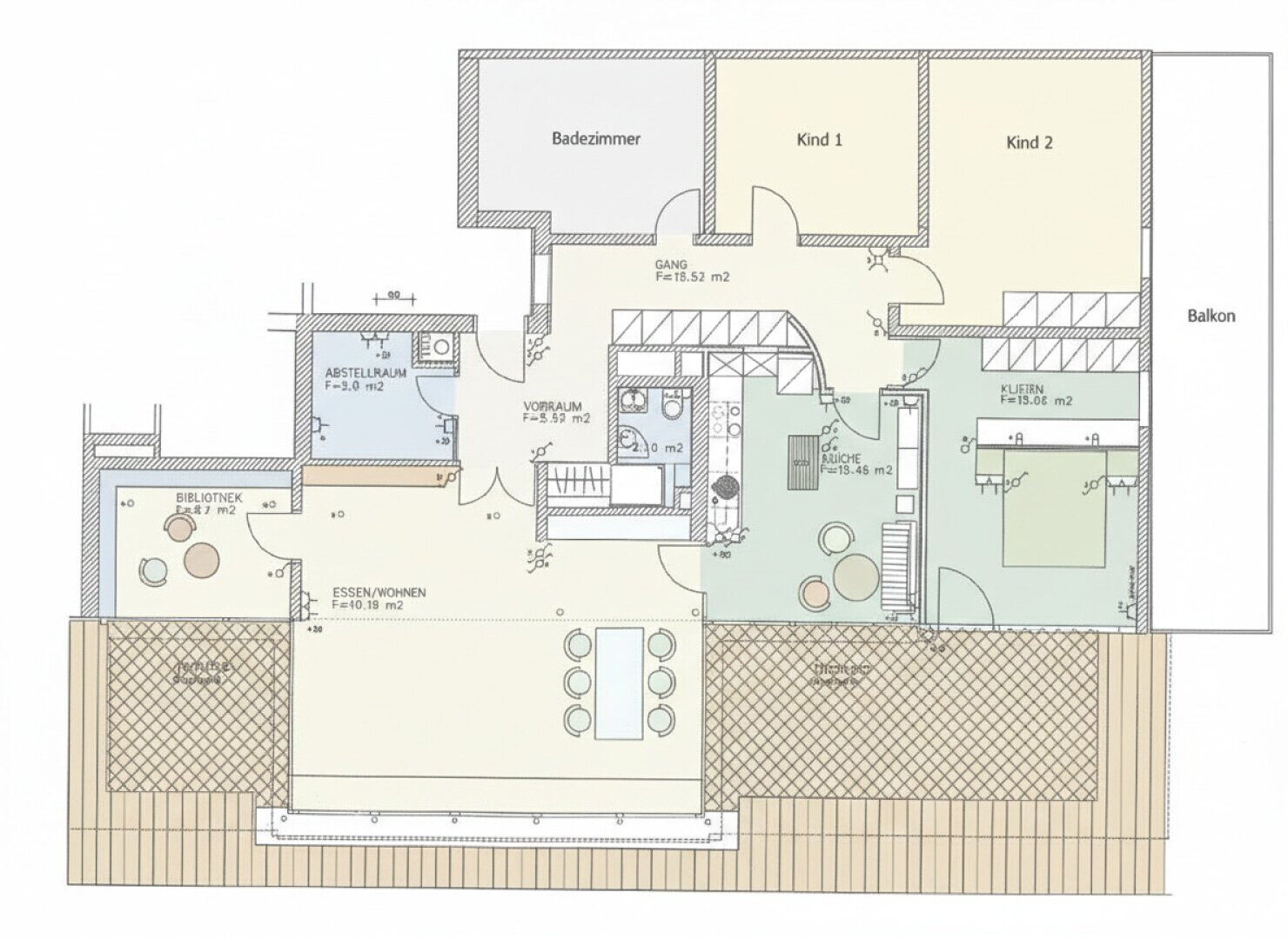 Das Herzstück bildet das sehr große Wohnzimmer mit angrenzender Küche und Essplatz, das ein besonders weites Raumgefühl vermittelt. Ergänzt wird die Wohnung durch mehrere großzügige Zimmer sowie praktische Nebenflächen, die vielfältige Nutzungsmöglichkeiten bieten.