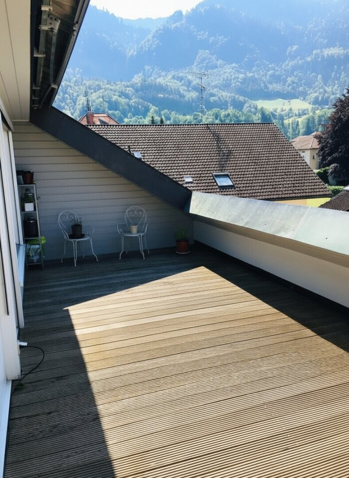 Ein besonderes Highlight sind die zwei sonnigen, südseitig ausgerichteten Terrassen, darunter eine besonders großzügige Fläche mit schönem Ausblick über Hohenems, sowie der zusätzlich vorhandene ortsseitige Balkon, die das Wohnen im Penthouse zu etwas Besonderem machen. Die zentrale Lage mit kurzen Wegen zu Einkaufsmöglichkeiten, Cafés und sämtlichen Einrichtungen des täglichen Bedarfs unterstreicht zusätzlich die hohe Wohnqualität.