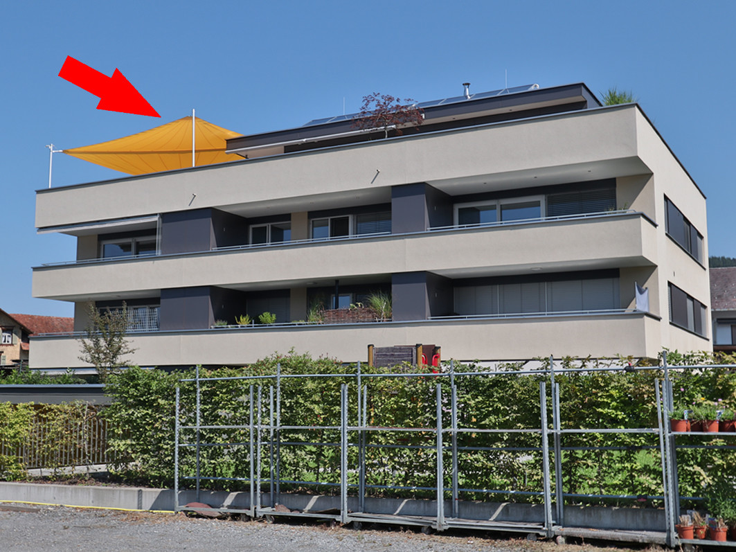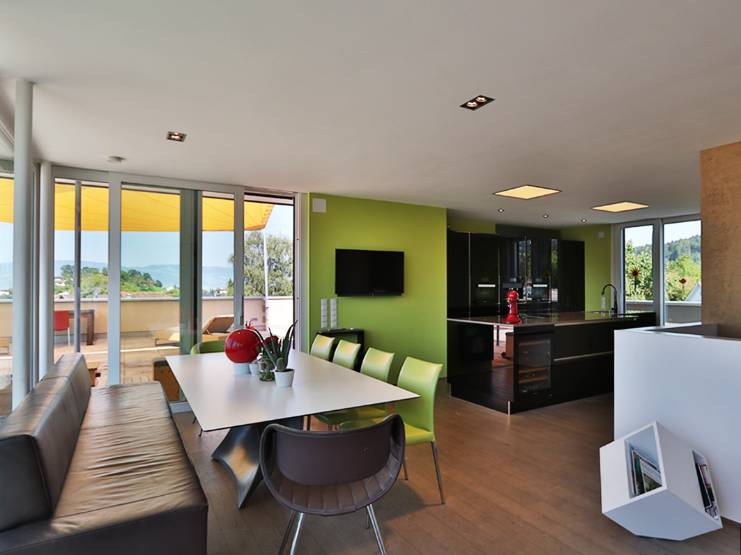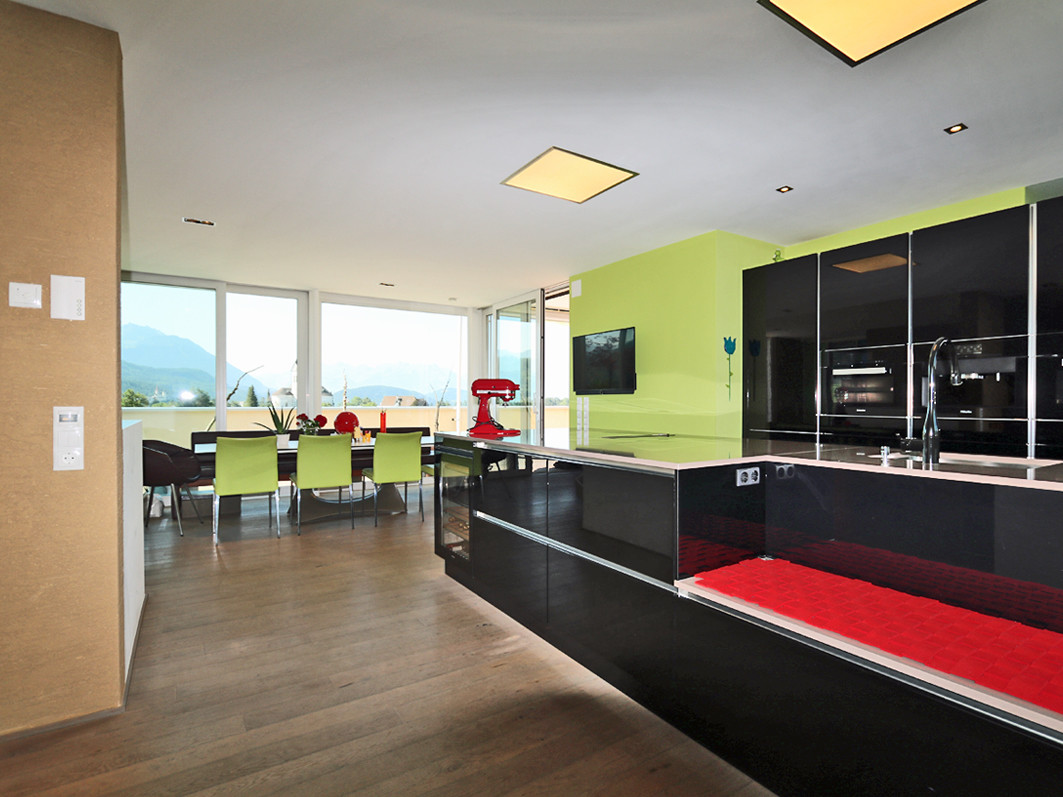 Vor etwa sieben Jahren fand der jetzige Eigentümer diese echte Penthouse-Wohnung mit der riesigen Dachterrasse in Sulz und dachte sich – ja, das ist genau das Richtige, nur fehlen noch zwei Zimmer für meine Familie. Da es sich um einen Neubau handelte und die darunter liegende Wohnung noch zur Verfügung stand, wurde diese kurzer Hand mit dem Penthouse verbunden. Kurzer Hand? Ja, aber das erforderte doch einigen Aufwand, denn für die beiden einzelnen Einheiten musste eine Verbindung geschaffen werden. Das bedeutete Umplanung und zusätzlichen Bauaufwand. Auch die Standardausstattung entsprach nicht seinen Vorstellungen und es wurde auch hier vieles verbessert. Das Ergebnis? Eine elegante, geräumige und moderne Maisonette-Wohnung auf zwei Etagen. Im zweiten Obergeschoss sind zwei Schlafzimmer und das Badezimmer mit Wanne, WC und zwei Waschbecken zu finden. Der große Balkon auf der Süd-Seite bietet sich sowohl für sonnige als auch für kühlere Tage an. Sein Gegenstück liegt ein Stockwerk höher: die rund 211 m2 große, uneinsehbare, Dachterrasse bietet nicht nur einen wundervollen und freien Blick auf die Berge, nein! Geschmackvoll und raffiniert ausgestattet umgibt sie die ganze Wohnung und bietet bereits morgens warme Sonnenstrahlen, Mittagssonne oder spektakuläre Sonnenuntergänge in den Bergen. Sinnvollerweise sind auf dieser Ebene auch der geräumige Wohn-/Essbereich mit Kaminofen, ein Schlafzimmer, ein Gäste-WC und die hochwertige Küche mit den üblichen Geräten, zusätzlichem Weinschrank und „versteckter“ Speis untergebracht. Der Lift führt direkt in die Wohnung. Die eingebaute Sitzbank lädt zu schönen Unterhaltungen am Kochplatz ein. Gegessen wird vor dem nach Süden gerichteten Panoramafenster mit tollem Blick auf die Berge – Bon appétit!
