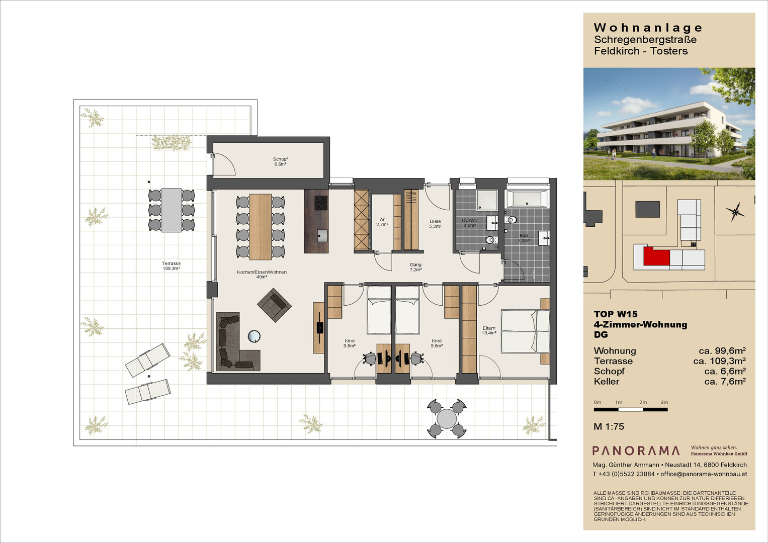 In sonniger, ruhiger und stadtnaher Lage in Feldkirch-Tosters entsteht unsere neue Wohnanlage. Die Gebäude sind so konzipiert, dass alle Wohnungen genügend Freiräume mit schönen Ausblicken bieten. Alle Wohneinheiten verfügen über geräumige Terrassen, die den Außenraum zum Wohnraum machen. Lassen Sie sich überzeugen von der hochwertigen Architektur sowie der sonnigen und unvergleichlichen Lage in einer der beliebtesten Wohngemeinden im Rheintal. Es entstehen 2-, 3- und 4-Zimmerwohnungen sowie schöne Dachgeschoss- Wohnungen. Die Wohneinheiten haben teilweise einen Gartenanteil oder großzügige Terrassen mit PANORAMA-Blick. Die Wohnanlage verfügt über einen Lift und eine Tiefgarage.