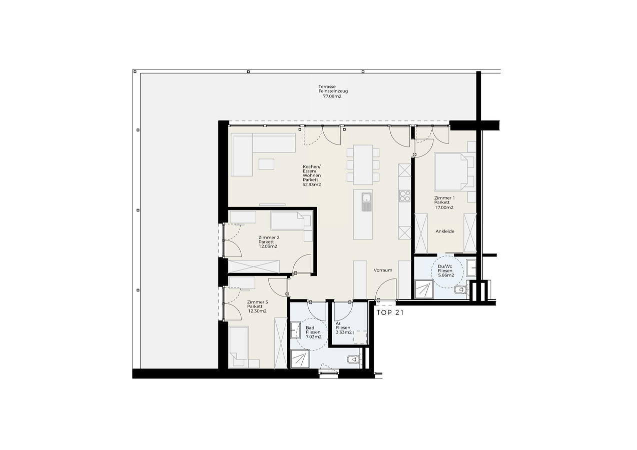Riesige Terrassen mit einer Größe von ca. 17,50 m² bis ca. 77 m² (Penthouse)