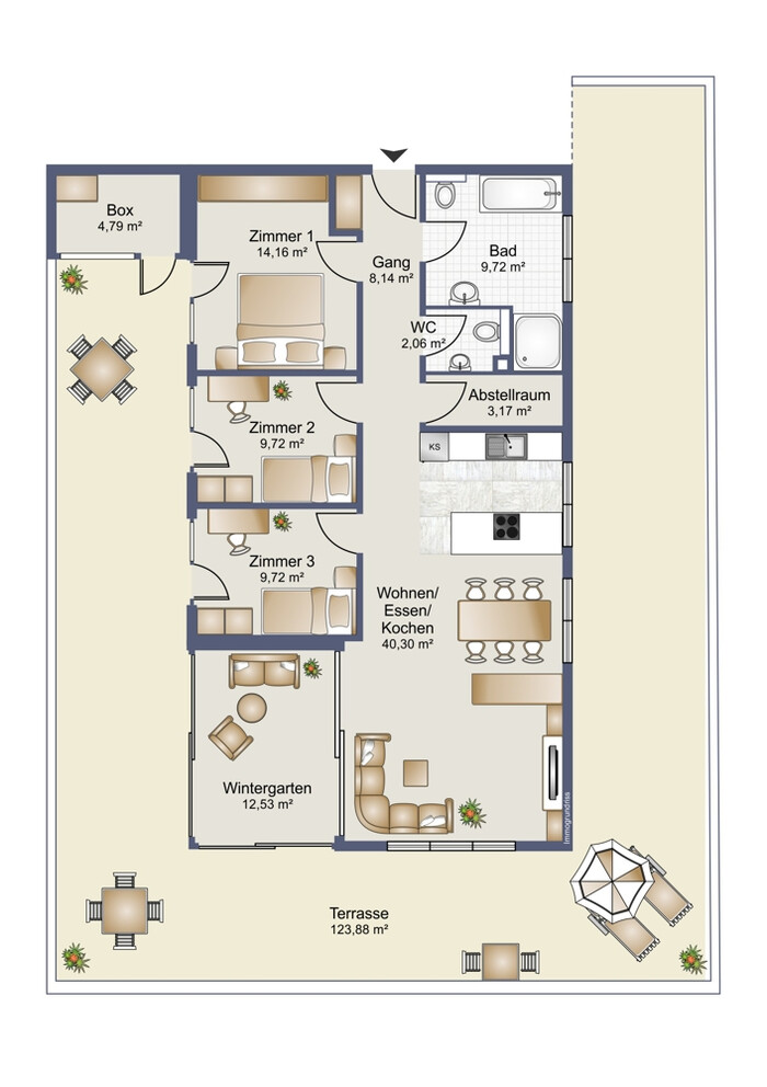 Ausrichtung Balkon: Süden, Westen, Nordwesten, Südwesten