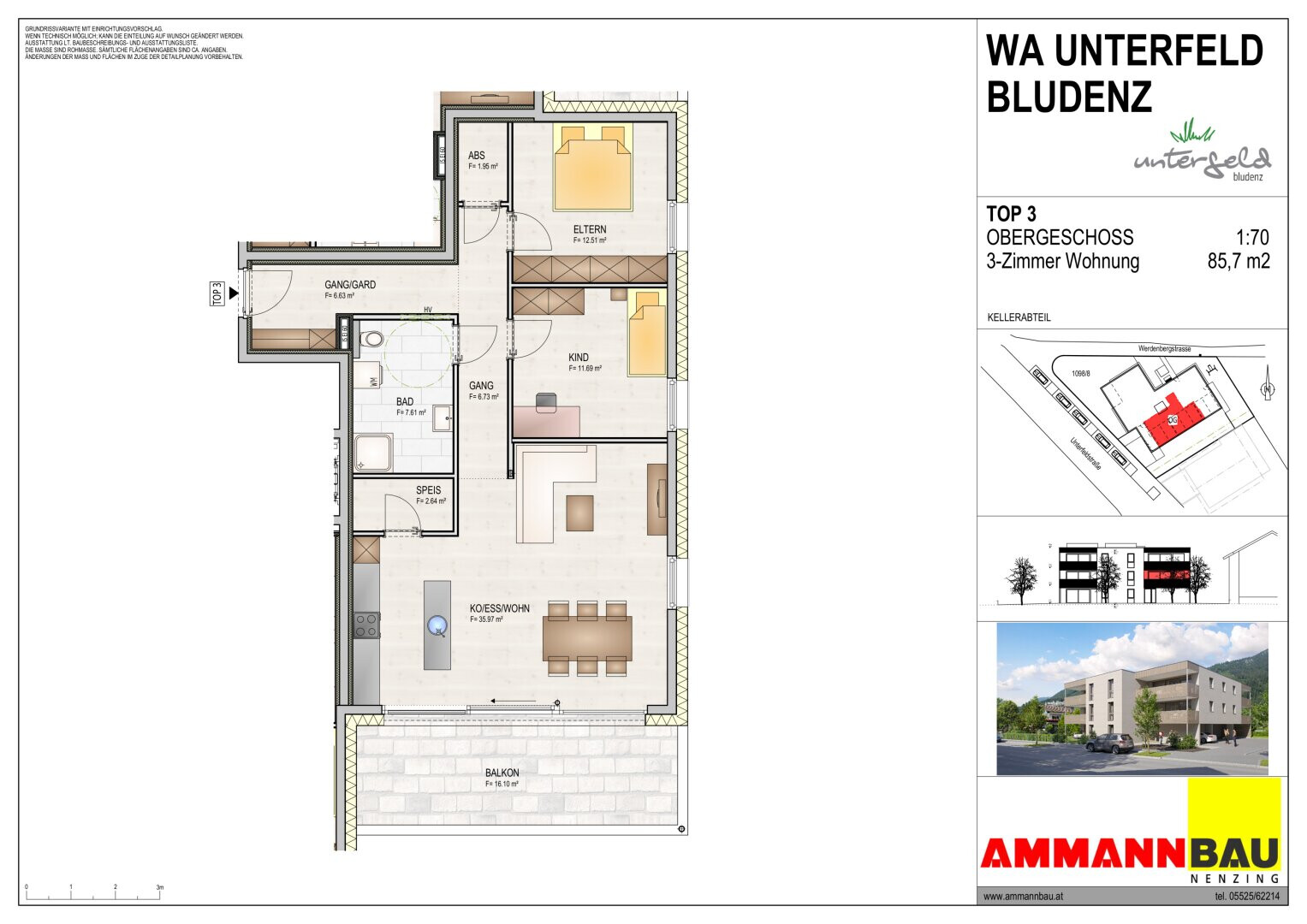 Ammann Wohnbau errichtet in Bludenz. Unterfeldstraße in gewohnter Wohnqualität Wohnungen zum wohlfühlen. Die geplante Kleinwohnanlage besticht durch moderne, zeitlos schöne Architektur. Nur 7 Einheiten versprechen ein ungewohntes Wohngefühl einer Wohnanlage. Die Wohnungen sind über einen Personenlift barrierefrei zugänglich. Die Wohnung im Erdgeschoss verfügt über einen eigenen Gartenanteil. Stellplätze für Besucher befinden sich im Außenbereich der Anlage, die Unterstellplätze befinden sich im Carport.welches um € 15.000.- zusätzlich erworben werden kann.