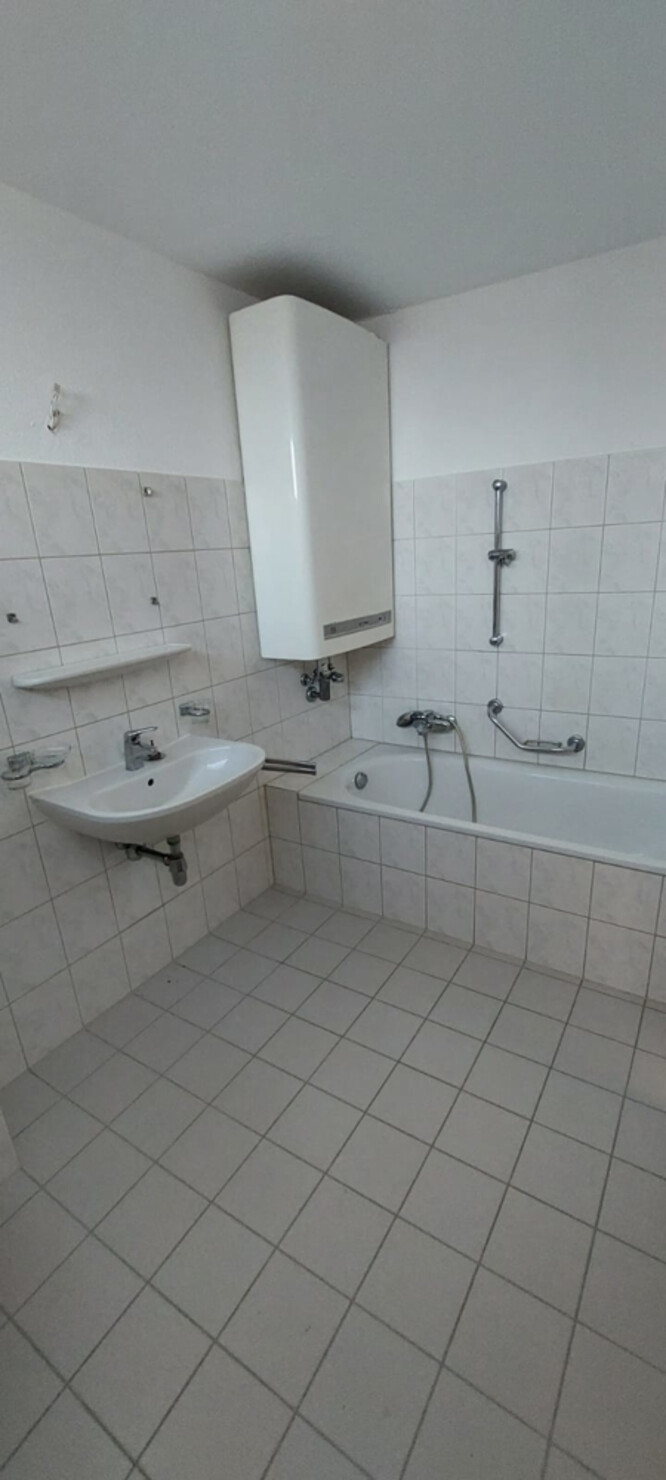 Badezimmer mit Badewanne, Waschmaschinenanschluss und WC