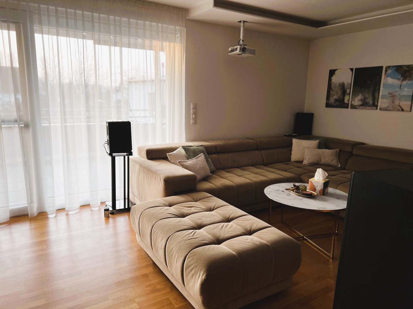 - offener Wohn-Essbereich mit Lehmwand und optionalem Heimkino-Setup (gegen Aufpreis)