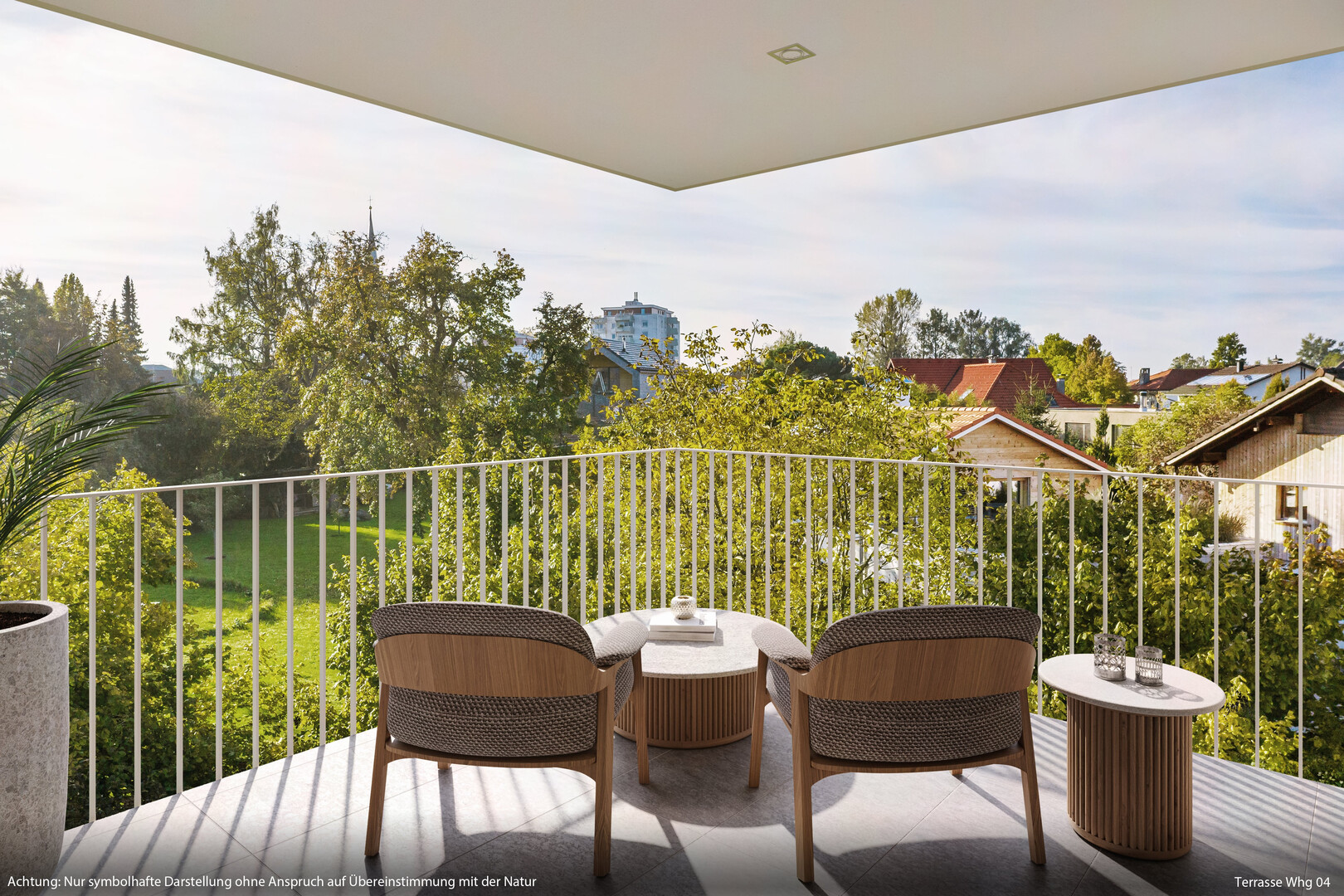 Sonnige Wohnqualität: Die überdachte Terrasse dieser Obergeschosswohnung schafft ein geschütztes Outdoor-Wohnzimmer, das zu jeder Jahreszeit genutzt werden kann. Genießen Sie die Aussicht und das helle, offene Wohnkonzept.