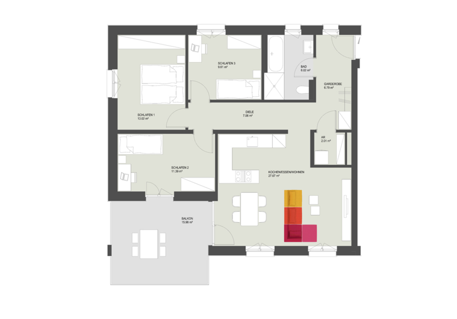 Am Ende des Flurs gelangen Sie in alle drei Schlafzimmer, welche genügend Platz für ein bequemes Bett sowie einen Kleiderschrank bieten.