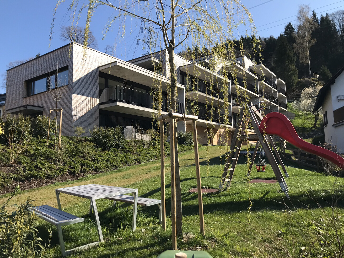 Die stufenförmig in den Hang gebettete Wohnanlage verfügt über eine attraktive Holzschindelfassade, welche durch Elemente in Sichtbeton ergänzt wird. Dem Anspruch, lichtdurchflutete Wohnungen zu gestalten, wurde der Architekt vollauf gerecht. Sämtliche Wohnungen sind südlich bzw. südwestlich ausgerichtet und verfügen über große Fensterfronten und großteils herrliche Ausblicke über das Rheintal bis hin zu den Schweizer Bergen.