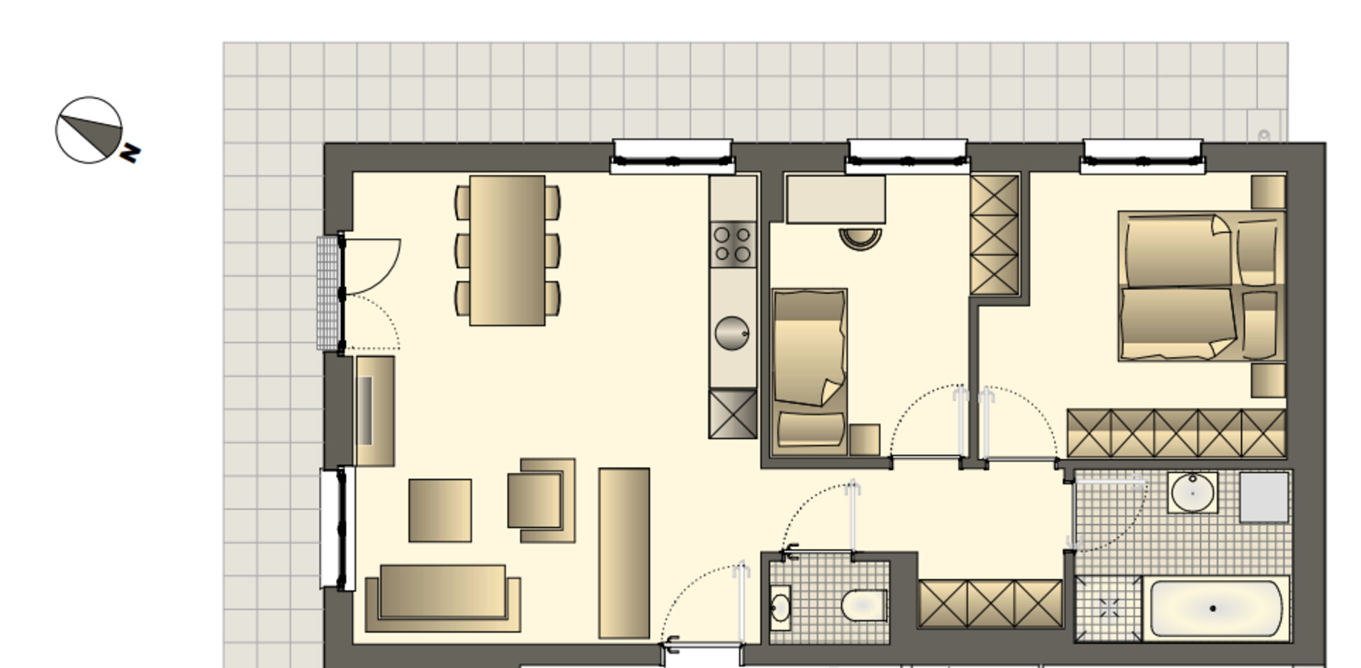 Aufteilung: Wohn/Esszimmer mit Küche, 2 Schlafzimmer, Bad mit Wanne u. Dusche, WC, Terrasse, Kellerabteil