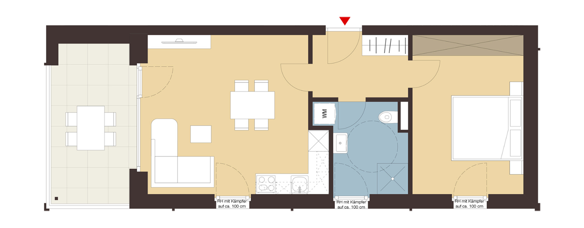 Ein durchgängig offener Wohnbereich und ein separates Schlafzimmer bieten eine ideale Raumaufteilung für eine oder zwei Personen. Die Terrasse ist direkt vom Wohnbereich aus zugänglich und erweitert den Wohnraum ins Freie.