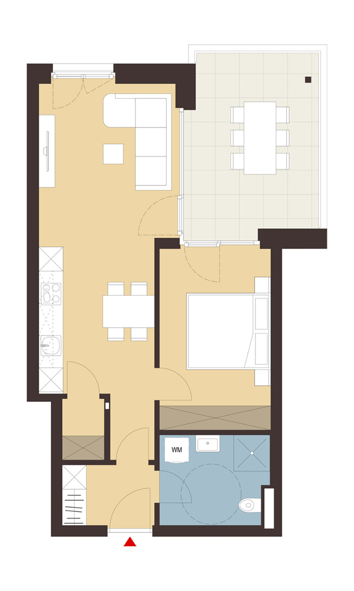 Ein durchgängig offener Wohnbereich und ein separates Schlafzimmer bieten eine ideale Raumaufteilung für eine oder zwei Personen. Die Terrasse ist direkt vom Wohnbereich aus zugänglich und erweitert den Wohnraum ins Freie.