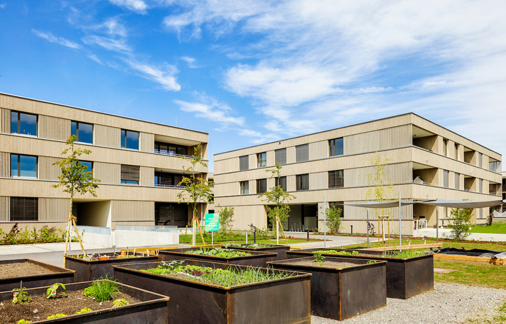 Die gemeinsame Quartiersmitte ist das Herz einer großzügig gestalteten Durchwegung zwischen den Baukörpern. Daran fügen sich die in den Naturraum eingebetteten Spielflächen, Rückzugsbereiche und Gemeinschaftsgärten. Zwei Tiefgaragen mit separaten Zufahrten und genügend Einstellplätzen, Kellerabstellräume, Trockenräume und Fahrradräume vervollständigen das Wohnkonzept.